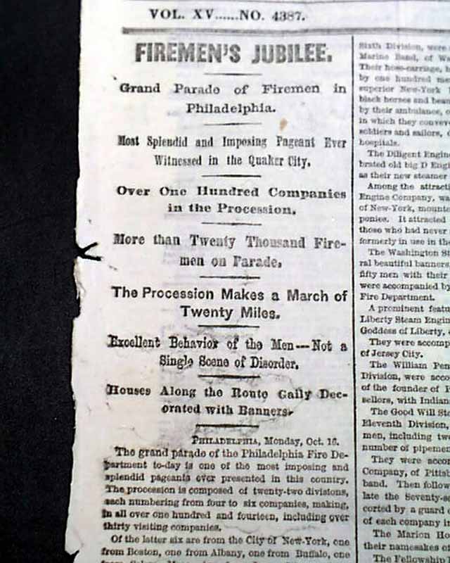 First column has heads include: "FIREMEN'S JUBILEE" "Grand Parade of Firemen in Philadelphia" with more on the celebration for the firemen.