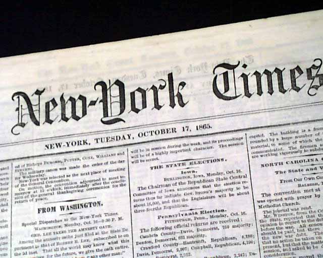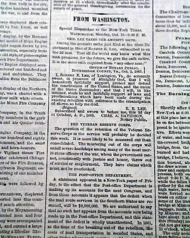 NEW YORK TIMES, Oct. 17, 1865 Near the top of the front page: "Gen. Lee Takes the Amnesty Oath" which includes the complete printing of the document in which he pledges to support the Constitution of the United States & support all laws regarding the emancipation of slaves, signed in type: R. E. Lee.