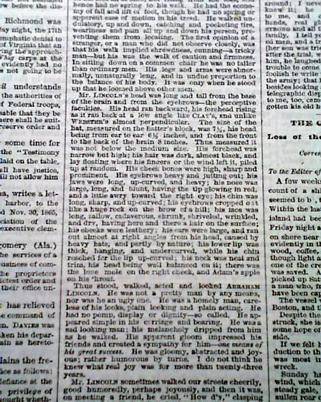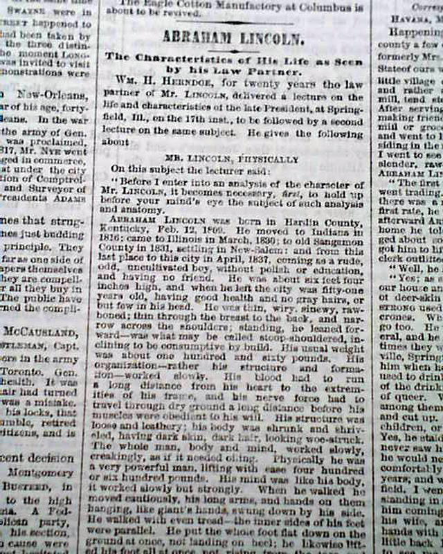 background: William Herndon’s 1865 lecture, as captured in this New York Times New Year's Eve edition, serves as a cornerstone of Lincoln scholarship because it bridged the gap between the mythic "Martyr President" and the gritty reality of the man. Herndon’s physical description—detailing Lincoln’s 6′4′′ frame, his sunken chest, and his unique, weather-beaten features—was intended to show that greatness could reside in a plain, even "homely," exterior. By pivoting to Lincoln’s "complex mind" and his humble social circles, the article highlights the paradoxical nature of a leader who was intellectually superior to his peers yet remained deeply connected to the common laborer. This specific printing is a poignant historical artifact; published at the very end of the year Lincoln was assassinated, it offered a grieving nation a way to reconcile the tragic loss of their leader by humanizing him through the eyes of the man who shared his law office for two decades.