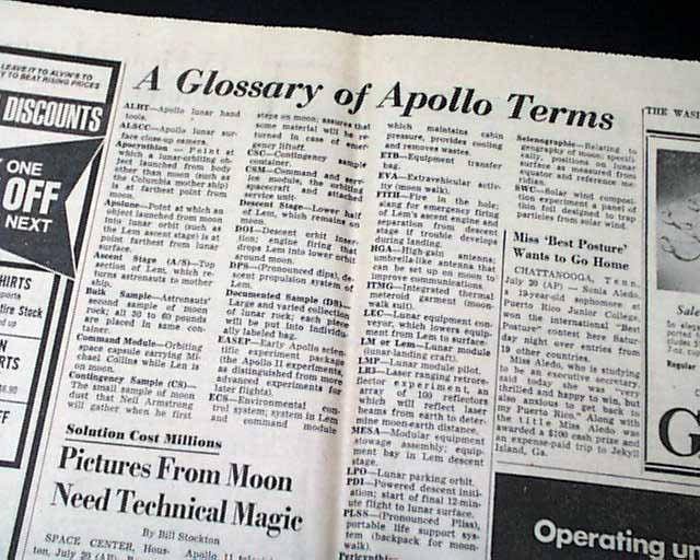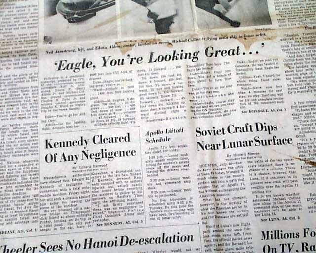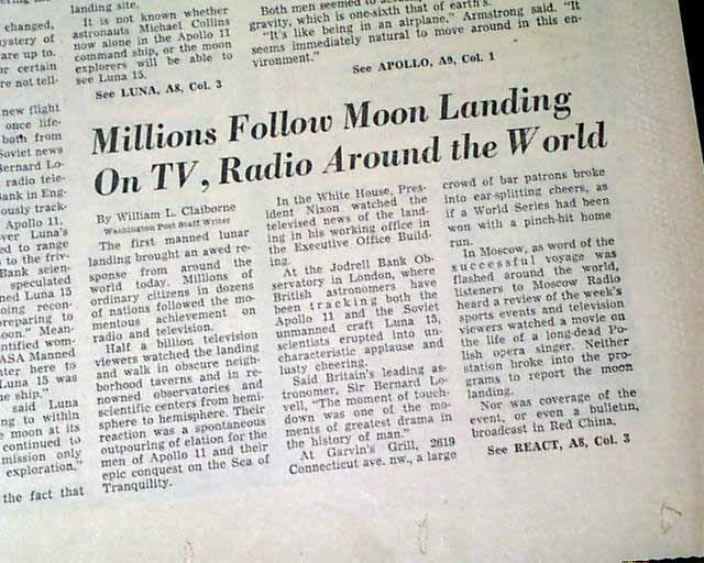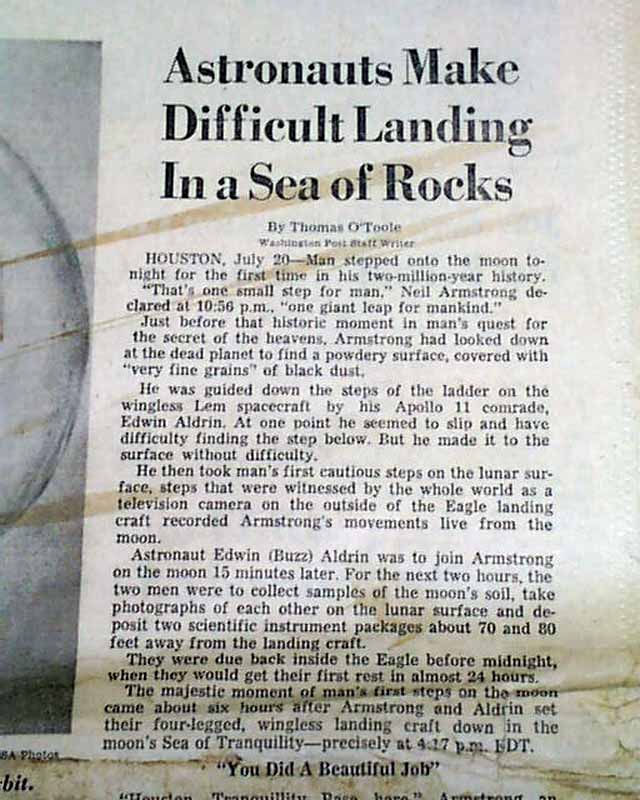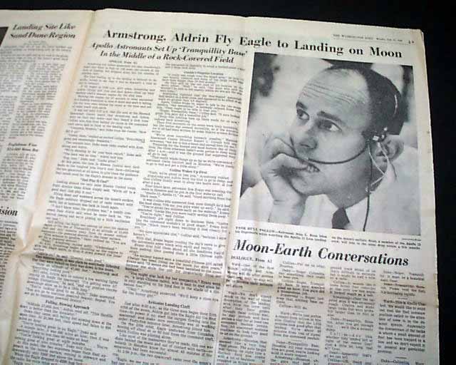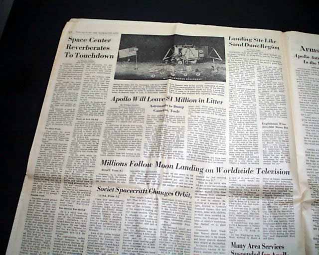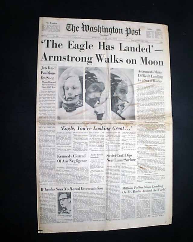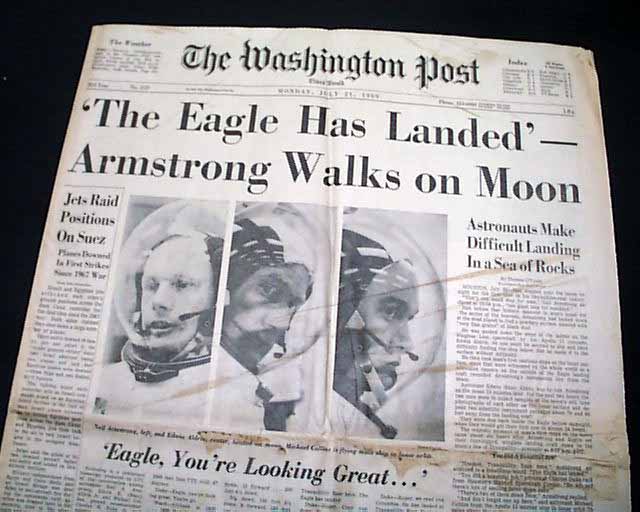 THE WASHINGTON POST, July 21, 1969 The banner headline proclaims: " 'The Eagle Has Landed' -- Armstrong Walks On Moon" with various related subheads and front page photos of Armstrong, Aldrin, and Collins. Great to have this historic event in a newspaper from the nation's capital.