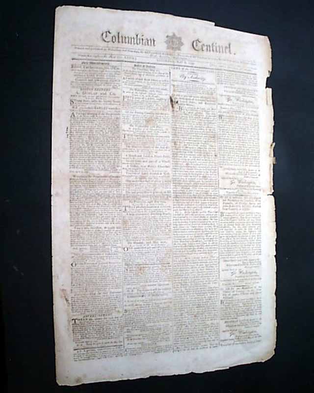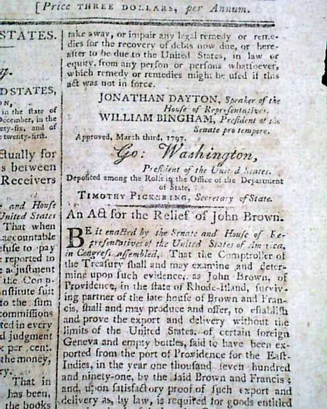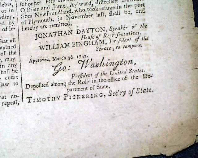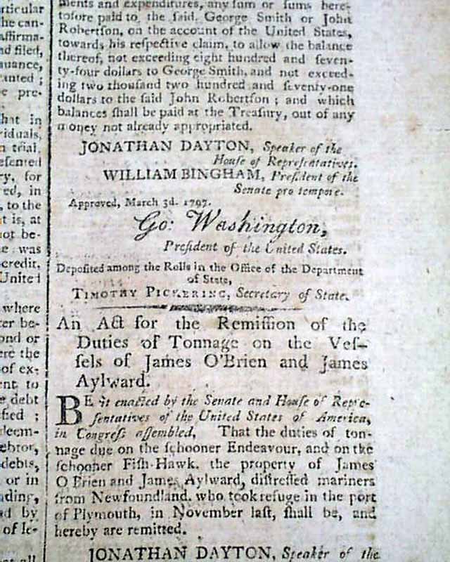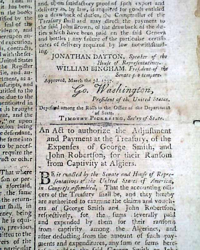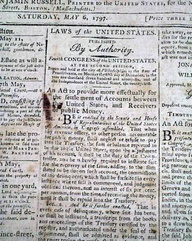 COLUMBIAN CENTINEL, May 6, 1797 On the front page under "Laws of the United States" are four "Acts" of Congress, each signed in script type: George Washington. The Acts take half of the front page.