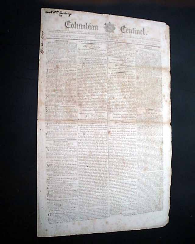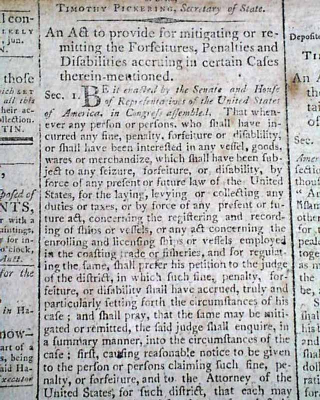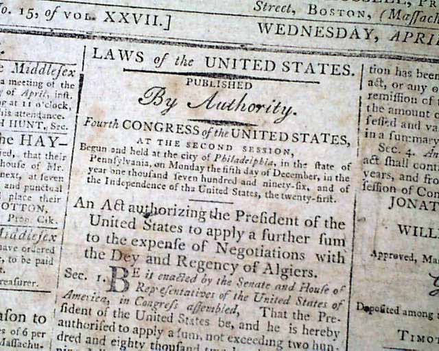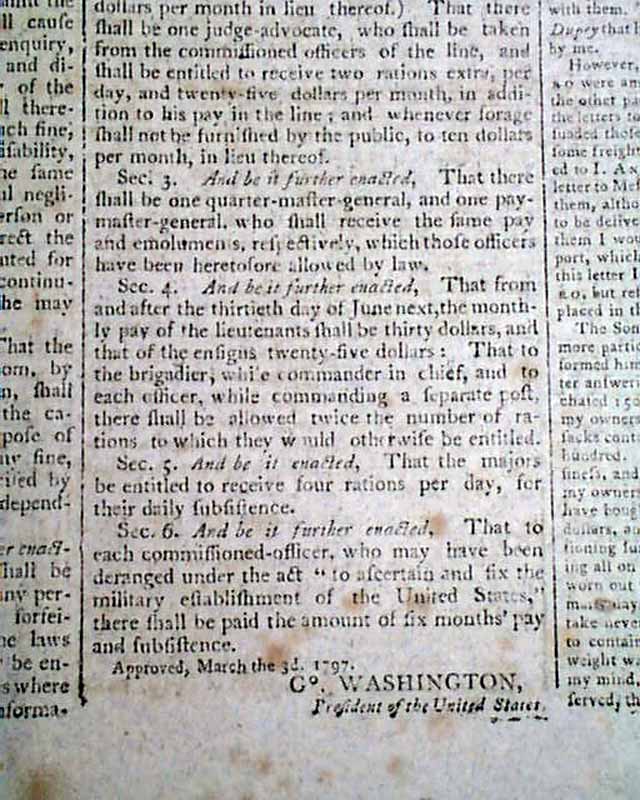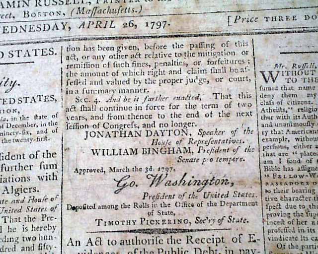 COLUMBIAN CENTINEL, Boston, April 26, 1797 Half of the front page features not one but four documents each signed by the President: Go. Washington, three of them signed in the very desirable script type. One of the Acts relates to fixing the military establishment of the United States.