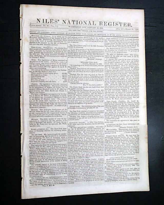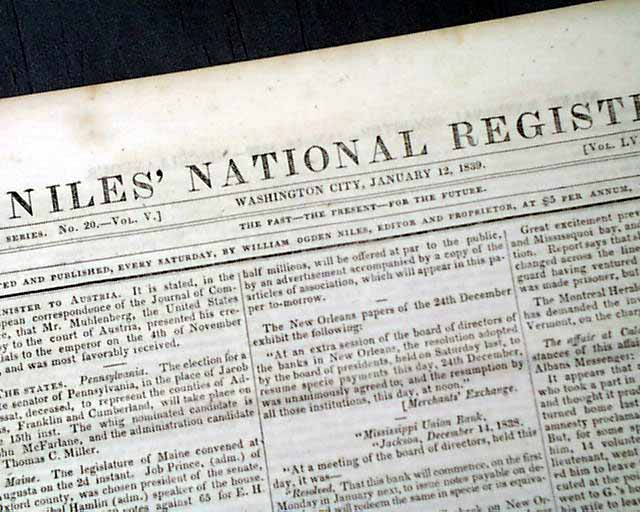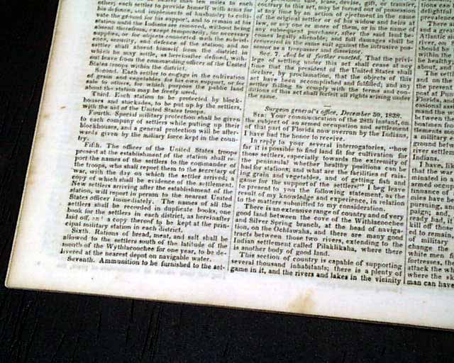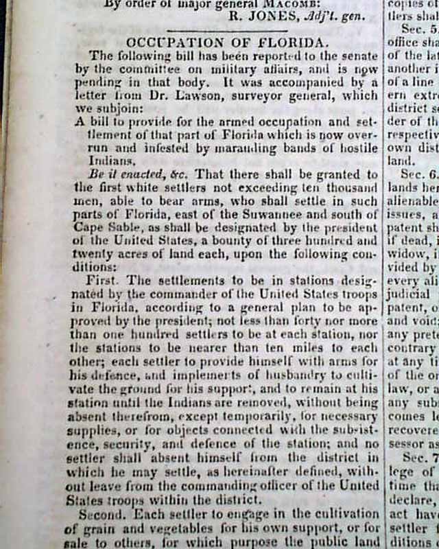 NILES' NATIONAL REGISTER, Washington City, Jan. 12, 1839 Included are 1 1/2 columns taken up with: "Occupation Of Florida" which is introduced with: "A bill to provide for the armed occupation and settlement of that part of Florida which is now overrun and infested by marauding bands of hostile Indians." with all six Sections.