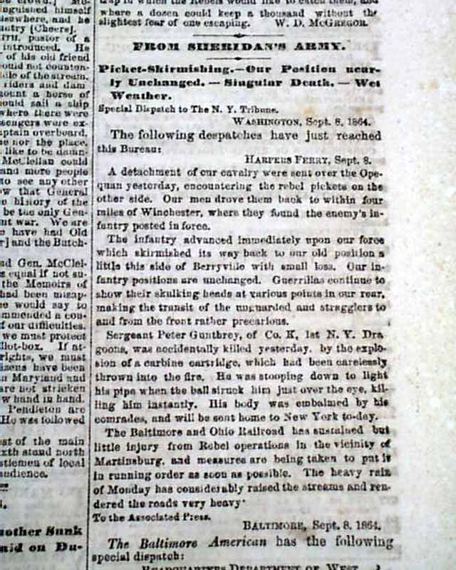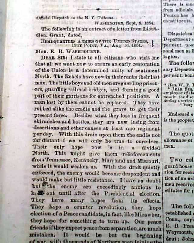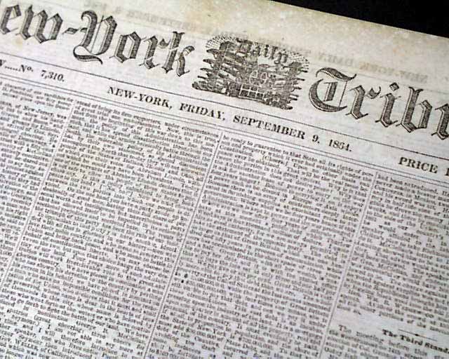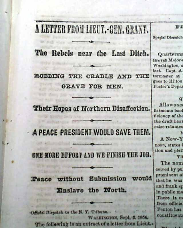 NEW YORK TRIBUNE, Sept. 9, 1864 Among the front page column heads on the Civil War: "General Grant's Preparations" "We Are On The Eve Of Battle" "Early Has Reinforced Lee" "Probable Attack From the Rebels" "Our Men Are Ready For Them" and more.