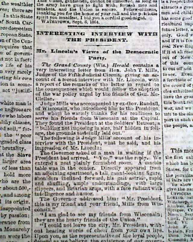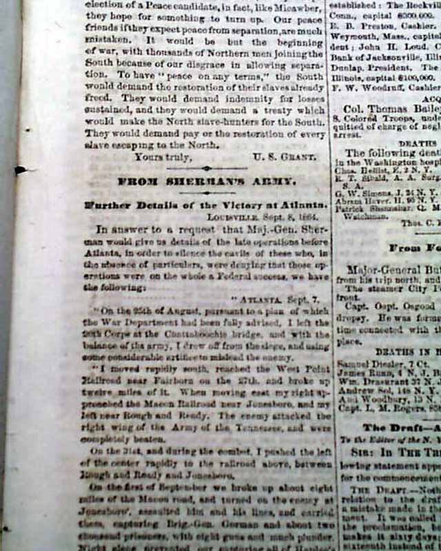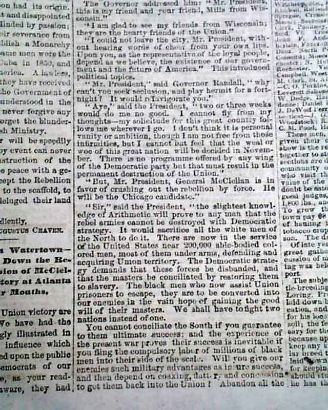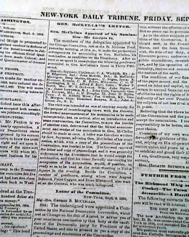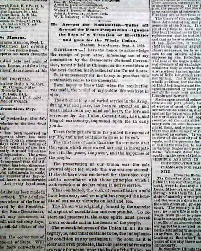 Additional reports inside including: "The Rebels Near the Last Ditch" which includes a letter signed in type: U. S. Grant; "Robbing the Cradle & the Grave For Men" "Peace Without Submission Would Enslave the North". Also content on General McClellan accepting the nomination for the Presidency. He would run against Lincoln in November. Also: "Interesting Interview With the President" & so much more.