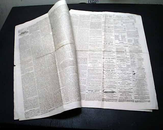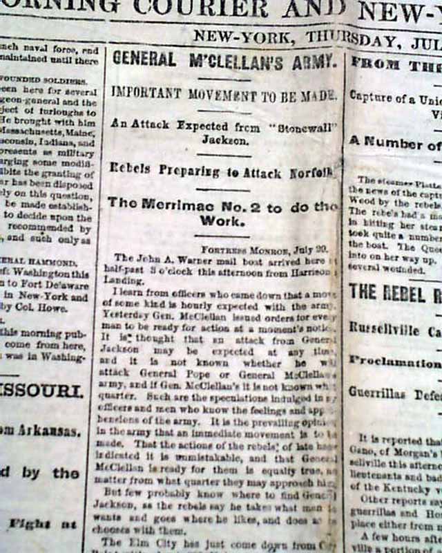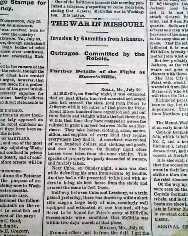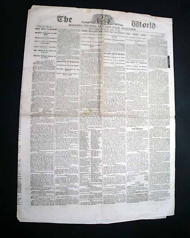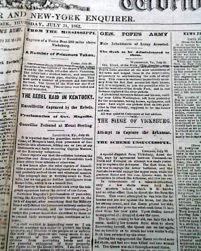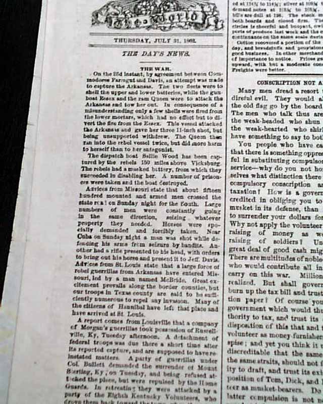 THE WORLD, New York, July 31, 1862 Among front page column heads on the Civil War are: "Reported Evacuation of Richmond" "Disloyalty in the District" "Arrest of a Colonel for Communicating with the Rebels" "The War In Missouri" "Invasion by Guerrillas from Arkansas" "Outrages Committed by the Rebels" "The Rebel Raid in Kentucky" "Rusellville Captured by the Rebels" "Rebels Preparing to Attack Norfolk" "Gen. Pope's Army" "The Siege of Vicksburg" & much more.