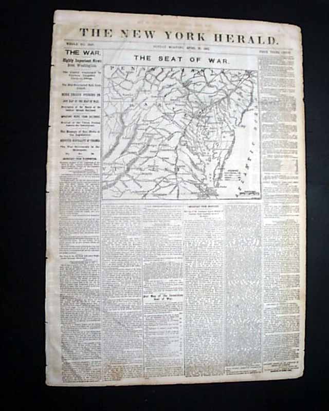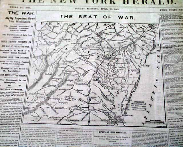 NEW YORK HERALD, April 28, 1861 The front page features a nice map titled: "THE SEAT OF WAR" showing portions of Pennsylvania, Maryland, New Jersey, Delaware, and Virginia.