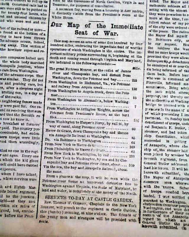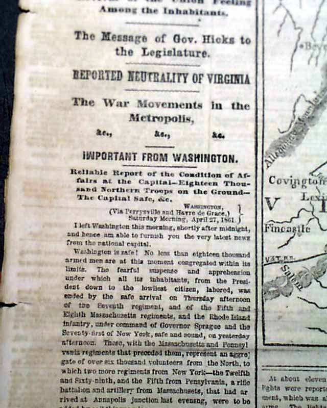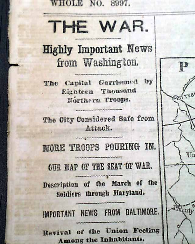 Among the one column headlines on the Civil War are: "THE WAR" "Highly Important News from Washington" "The Capital Garrisoned by Eighteen Thousand Northern Troops" "The City Considered Safe from Attack" "More Troops Pouring In" "Description of the March of the Soldiers through Maryland" "Reported Neutrality of Virginia" and more.