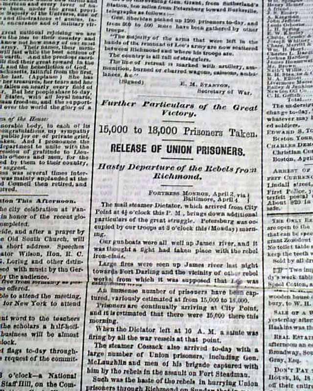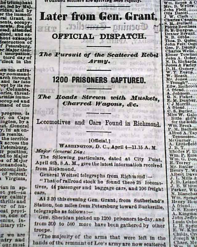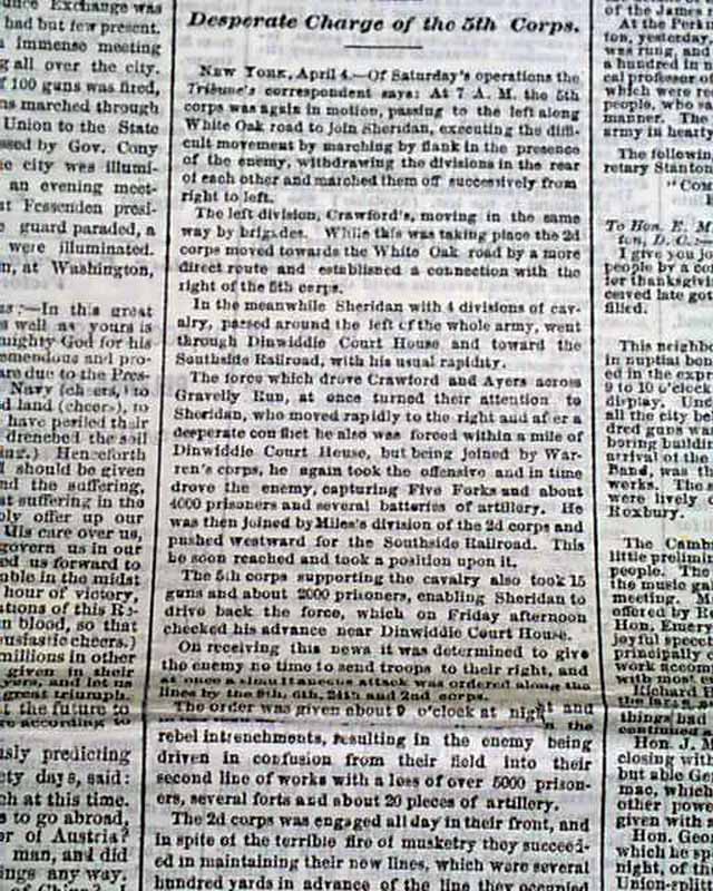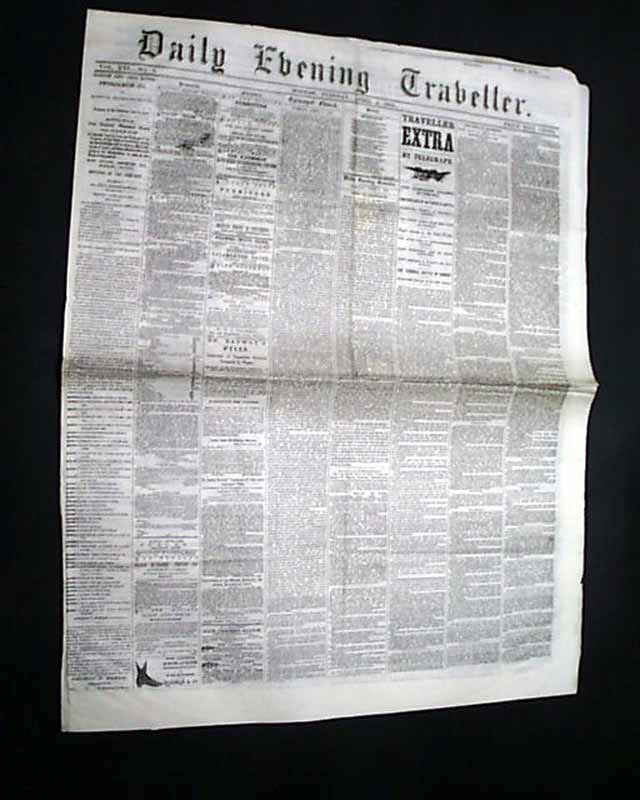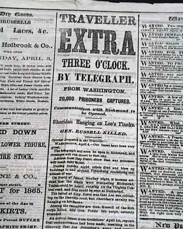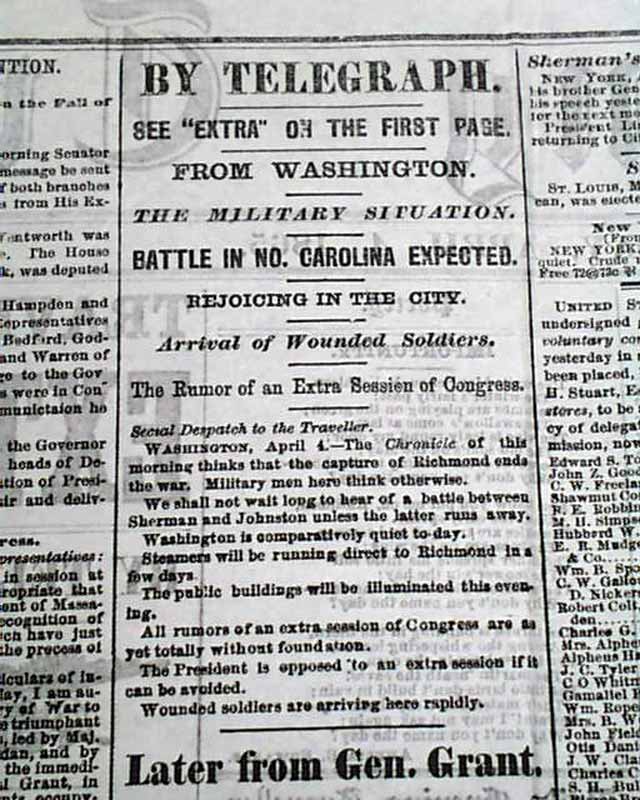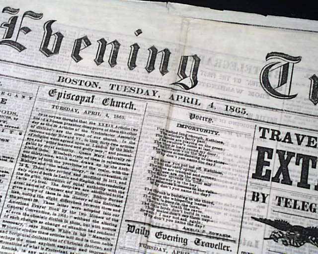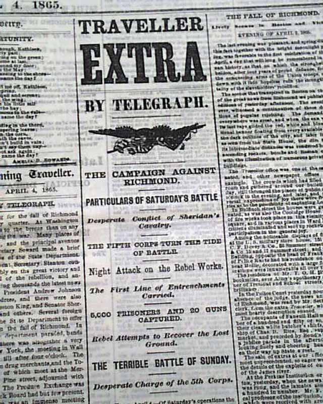 DAILY EVENING TRAVELLER, Boston, April 4, 1865 A fine issue from the final days of the Civil War with front page column heads concerning the capture of the Rebel capital: "The Campaign Against Richmond" "Particulars of Saturday's Battle" "The Fifth Corps turn the Tide of Battle" "5,000 Prisoners & 30 Guns Captured" "Rebel Attempts to Recover the Lost Ground" and more.