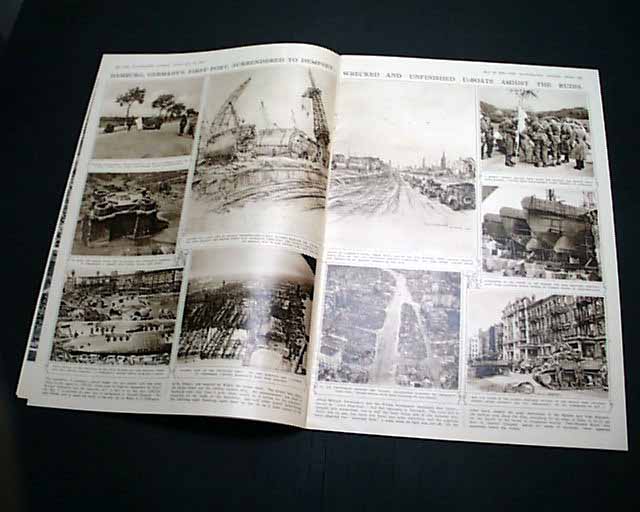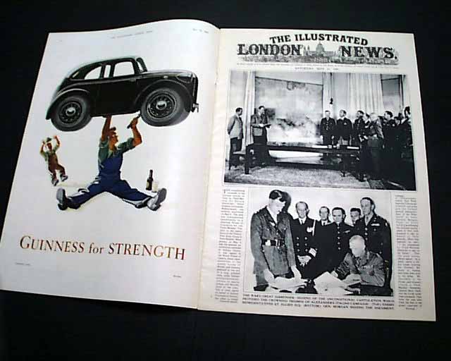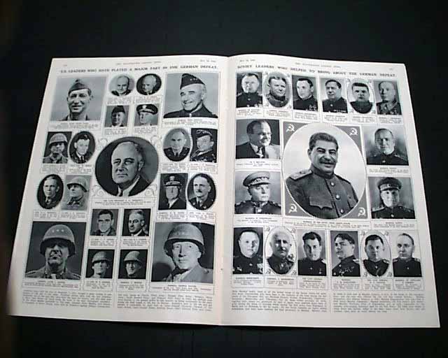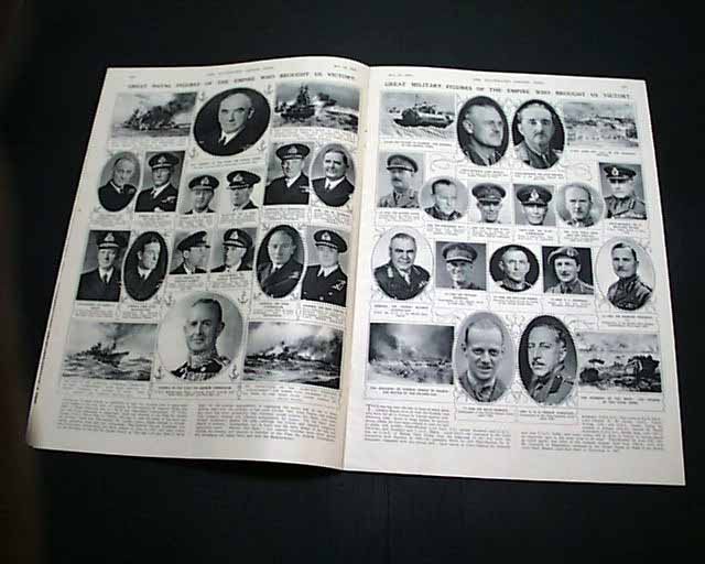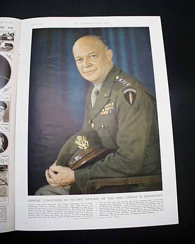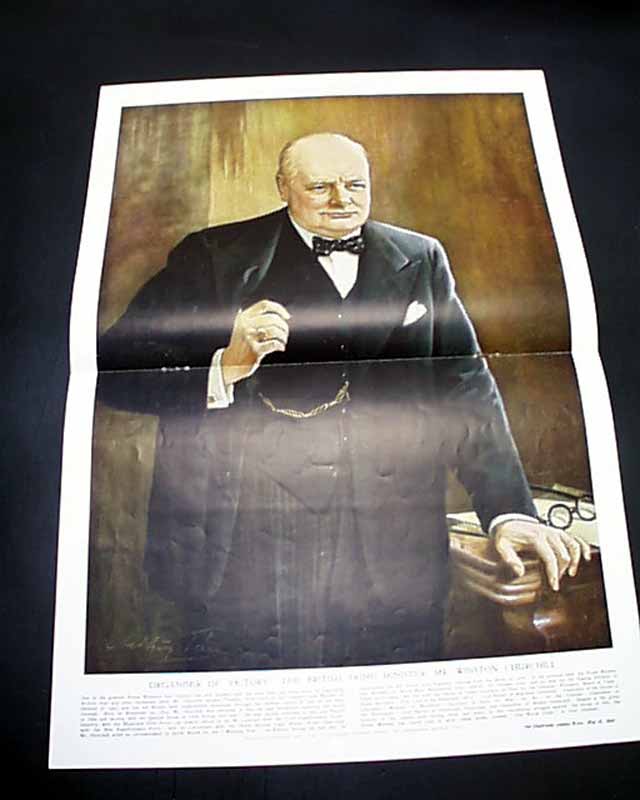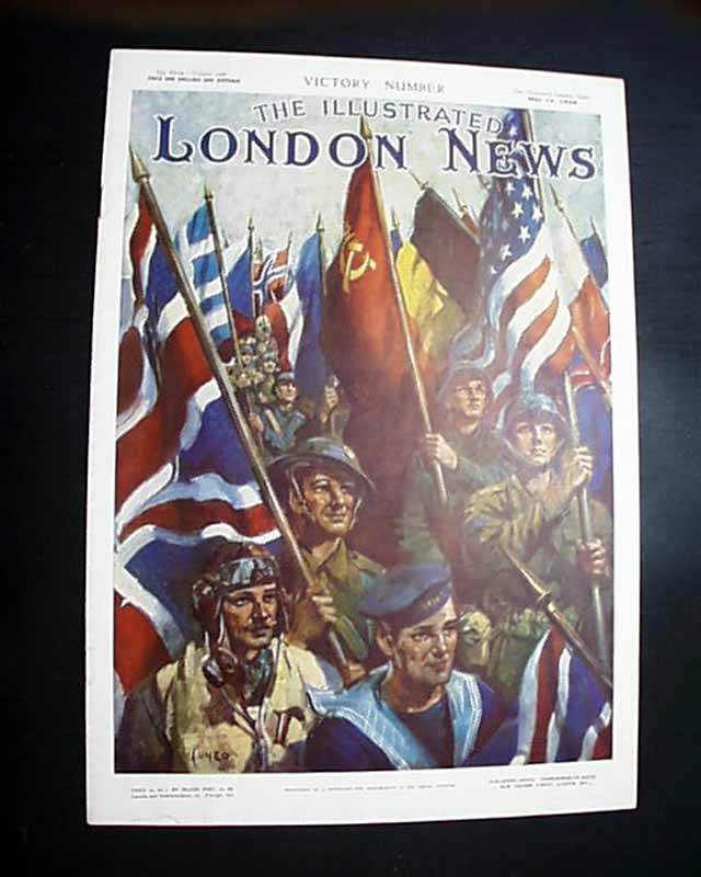 THE ILLUSTRATED LONDON NEWS, England, May 12, 1945 This famous magazine has one of the finest, most patriotic front covers we have seen on the end of the war in Europe. Very colorful, it shows soldiers from many nations representing the Allied forces. The inside has a double-page color print of Winston Churchill and a full-page color print of Dwight D. Eisenhower.