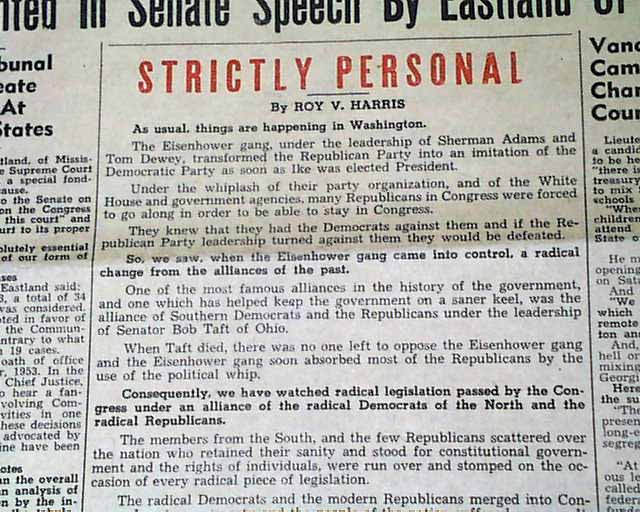 Front page headlines include: "Moscow Will Not Run Georgia Schools Through U.S. Supreme Court And Ike" "Communistic Voting Record of U.S. Supreme Court Pin Pointed In Senate Speech By Eastland Of Mississippi".