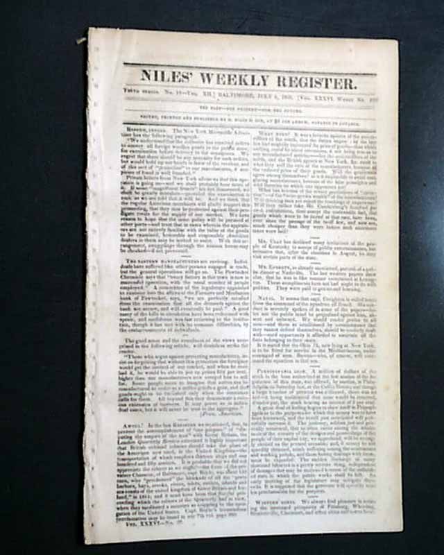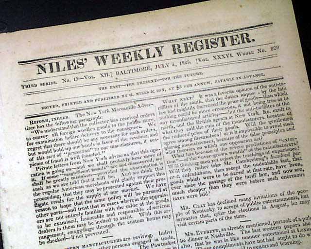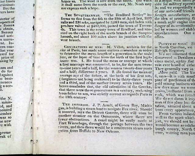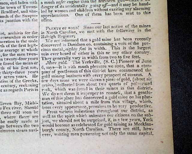 NILES' WEEKLY REGISTER, Baltimore, July 4, 1829 Page 3 has a brief report on: "The Susquehannah" and its use by arks & rafts in the Bradford, Pennsylvania area. Also: "Plenty of Gold!" begins: "We are informed that a gold mine has been recently discovered in Davidson co. containing a vein of the precious metal eighty feet in width..." with more detail.