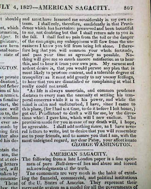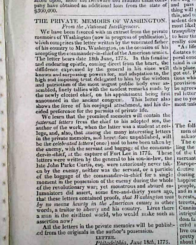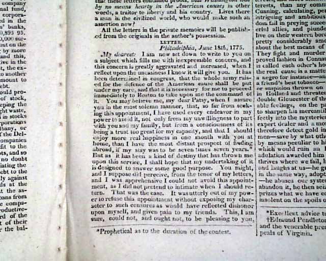 Inside has: "The Private Memoirs of Washington" which were then in the process of being published. Highlighted is the terrific letter by him dated Phila., June 18, 1775 sent to his wife and telling her of his appointment by Congress to be commander-in-chief of the Continental Army, signed in type: George Washington.