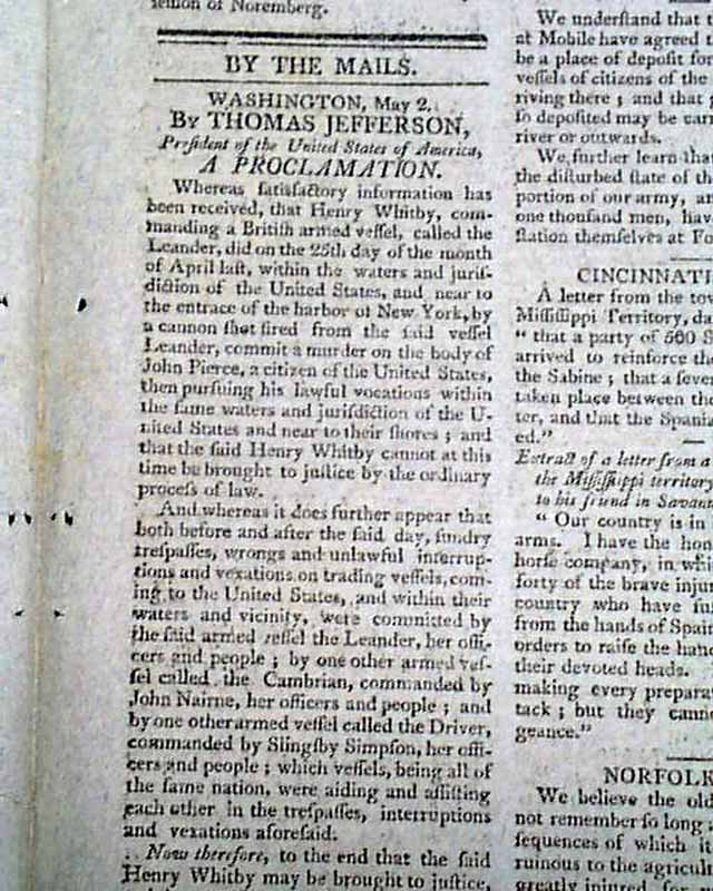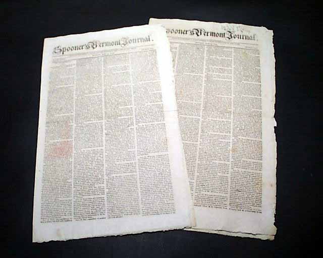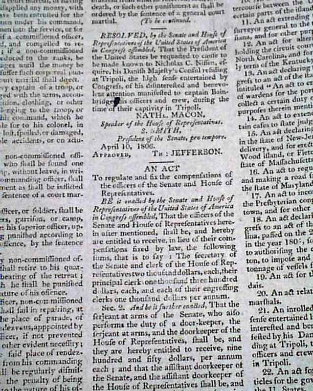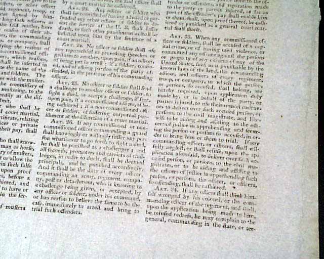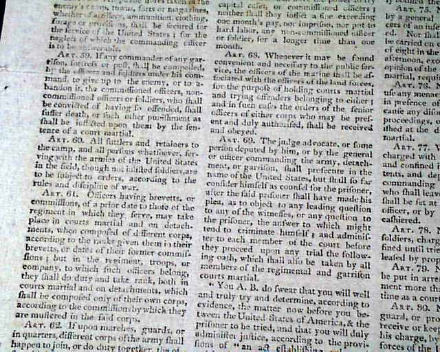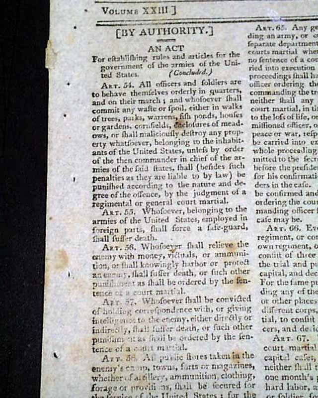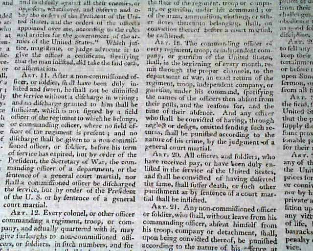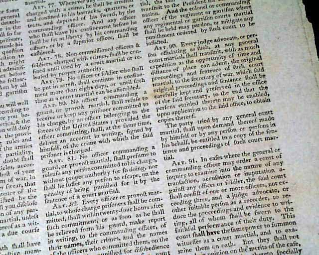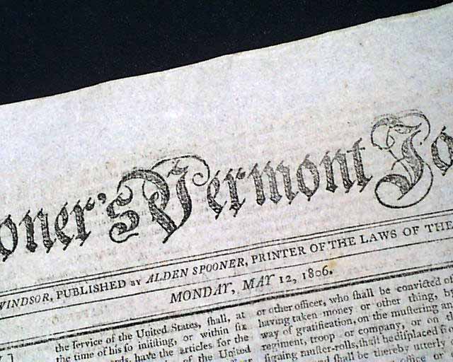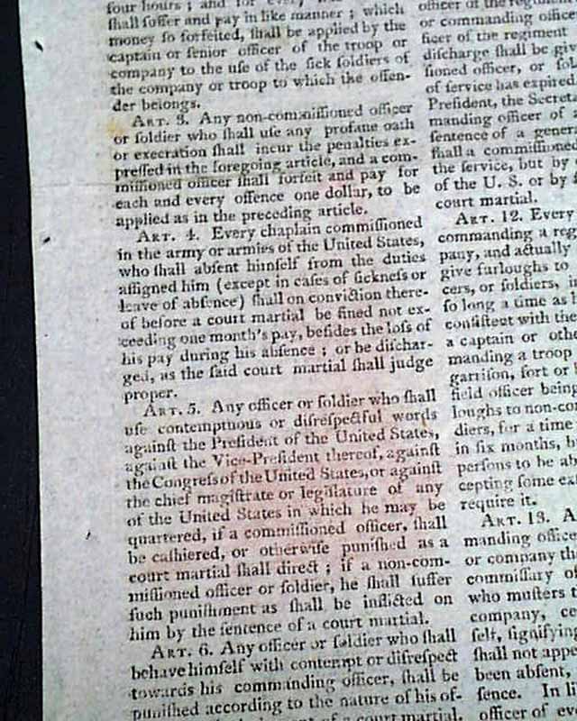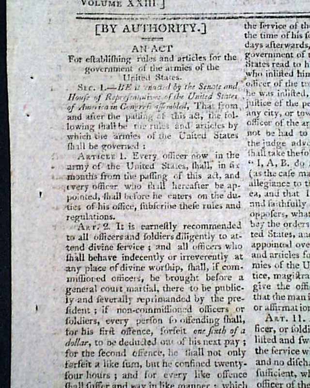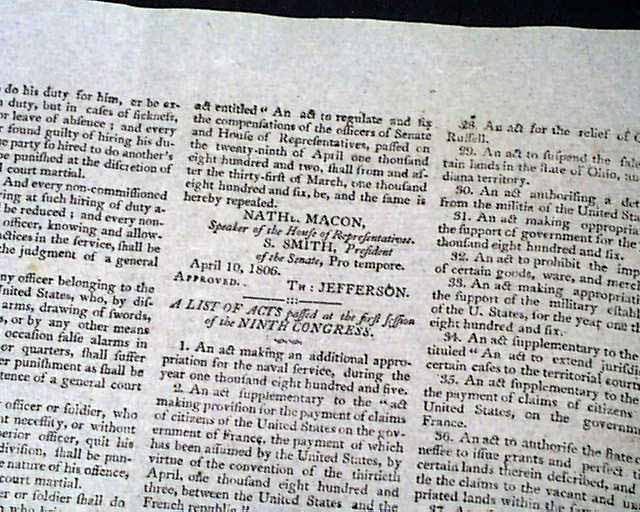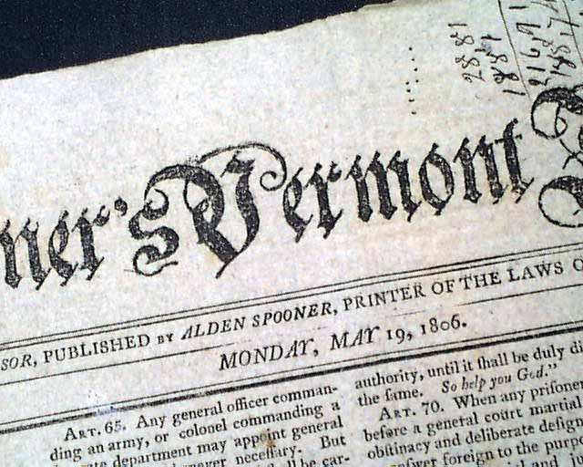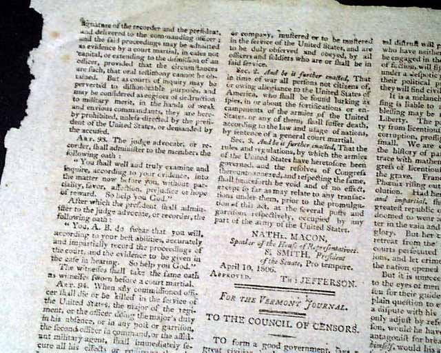 SPOONER'S VERMONT JOURNAL, Walpole, May 12 and 19, 1806 This is a pair of issues containing the full text of: "AN ACT For Establishing Rules & Articles for the Government of the Armies of the United States", which is very lengthy and signed at its conclusion in the May 19 issue: Th. Jefferson.