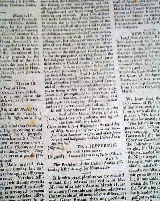 The May 12 issue also has: "An Act to Regulate & Fix the Compensation of the Officers of the Senate & House of Representatives" signed in type: Th. Jefferson. And the May 19 issue also has: "A PROCLAMATION" signed in type: Th. Jefferson.