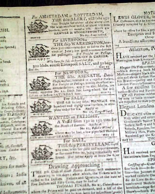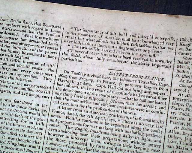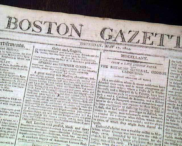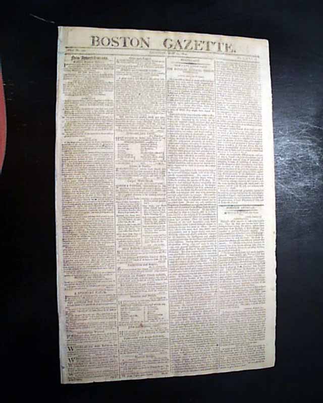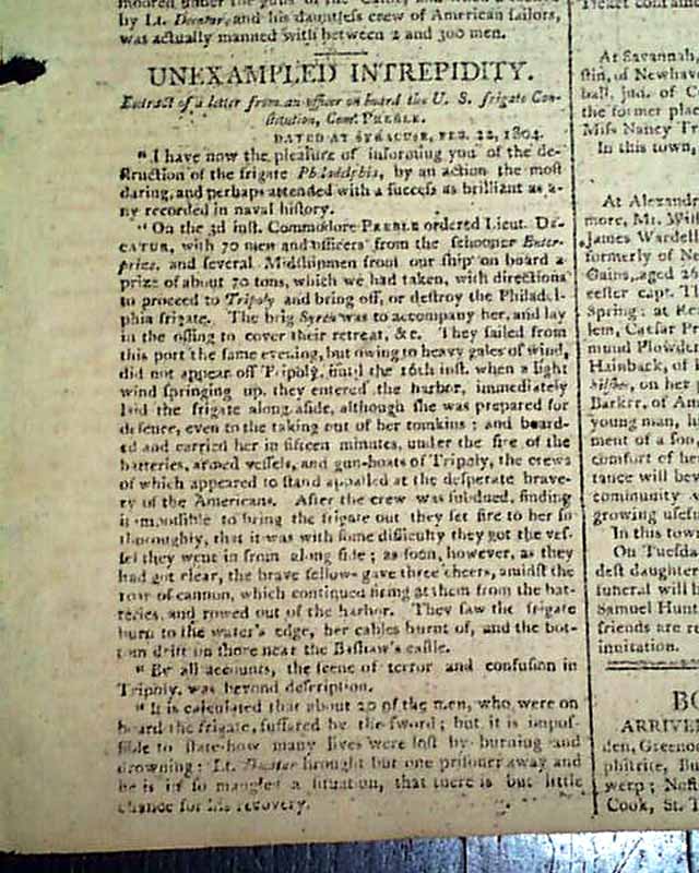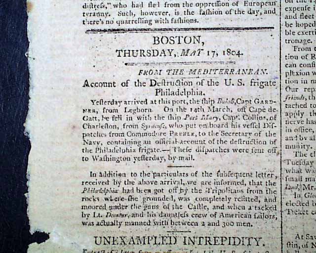 BOSTON GAZETTE, May 17, 1804  Page 2 has an historic report on the Tripolitan War with the capture of the U.S.S. Philadelphia. As noted in Wikipedia: "In October 1803, Tripoli's fleet captured USS Philadelphia intact after the frigate ran aground on a reef while patrolling Tripoli harbor. Efforts by the Americans to float the ship while under fire from shore batteries and Tripolitan Naval units failed. The ship, its captain, William Bainbridge, and all officers and crew were taken ashore and held as hostages."