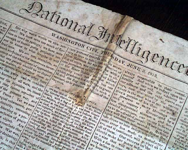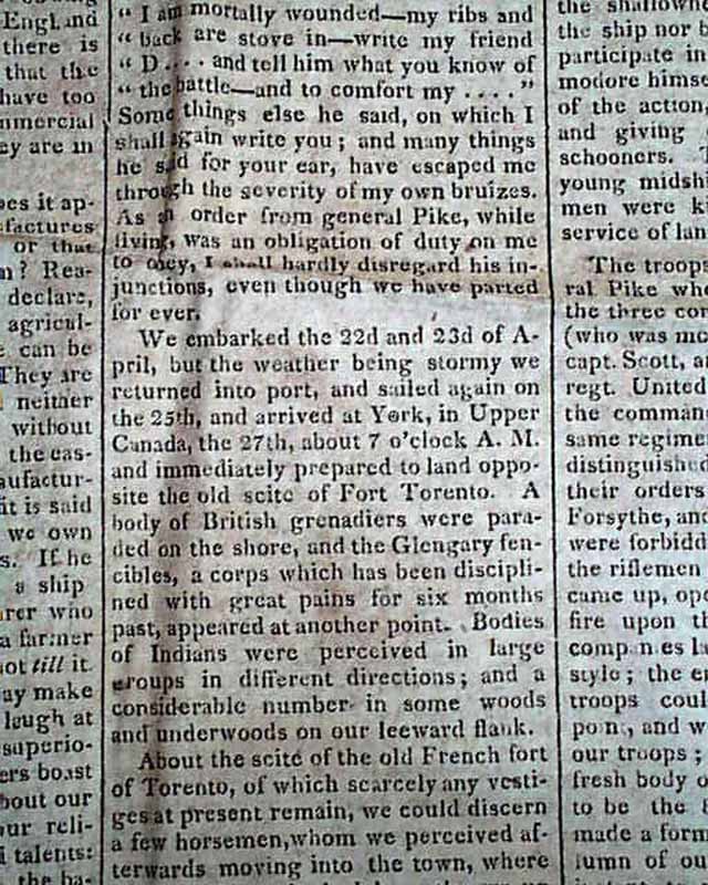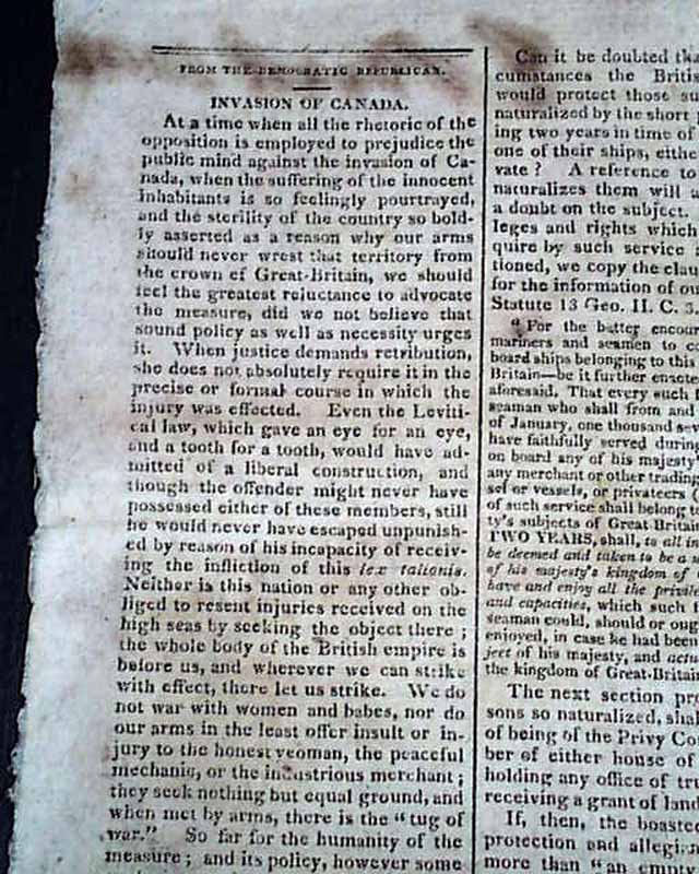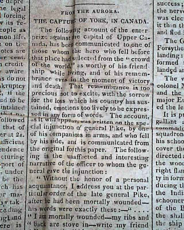 NATIONAL INTELLIGENCER, Washington, D.C., June 3, 1813 Page 2 has most of a column taken up with: "Invasion of Canada". Also inside are: "Protection & Allegiance" "British Monarchy" and the back page has: "The Capture of York, In Canada" (present-day Toronto), this report taking half of the page.