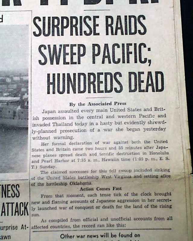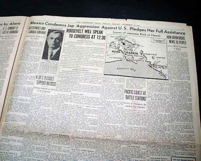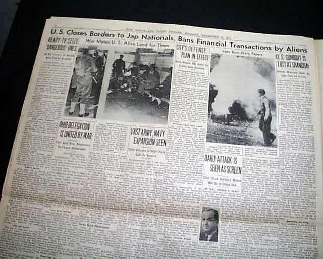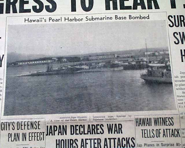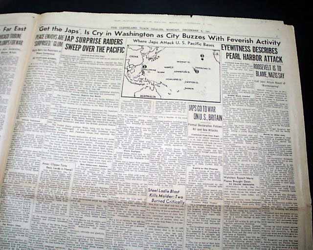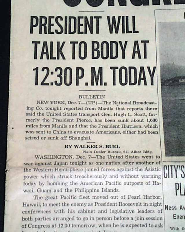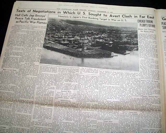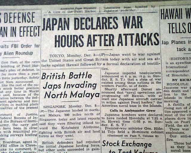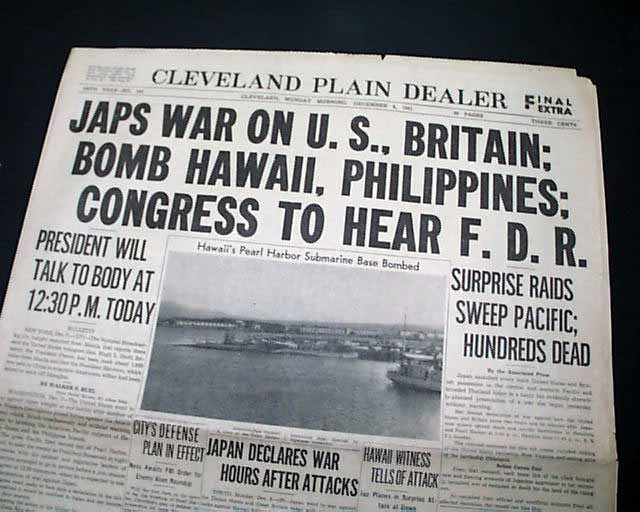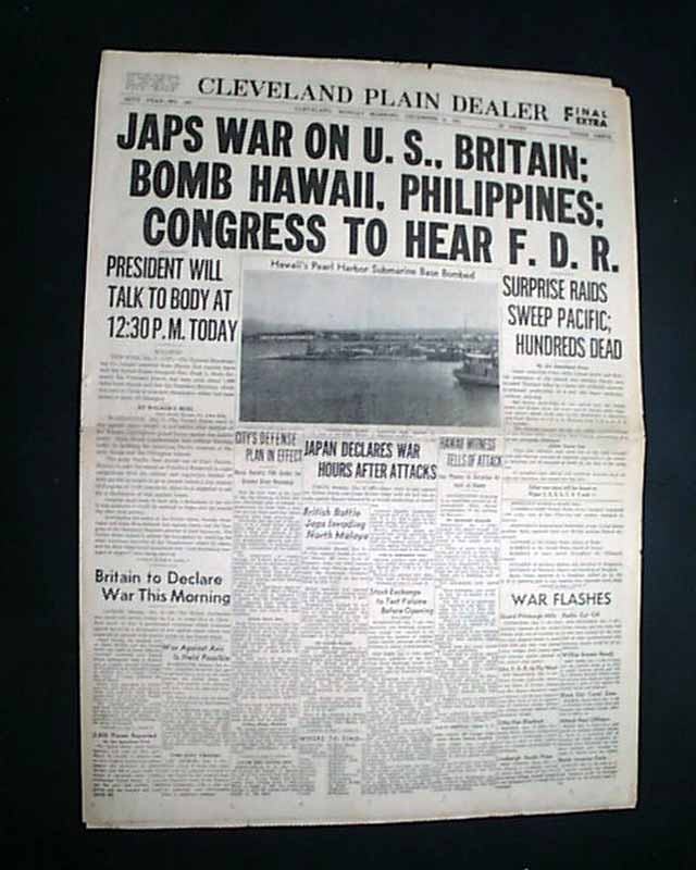 CLEVELAND PLAIN DEALER, Ohio, Dec. 8, 1941 The front page 3 line banner headline announces: "JAPS WAR ON U.S., BRITAIN; BOMB HAWAII, PHILIPPINES; CONGRESS TO HEAR F. D. R." with many related subheads. The front page has a photo of the submarine base at Pearl Harbor.