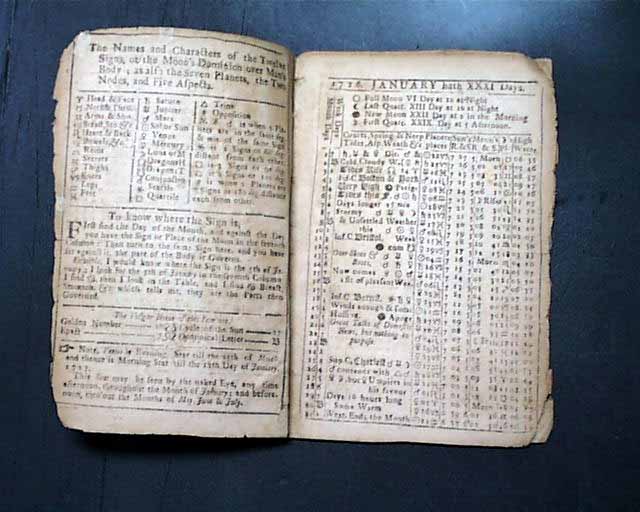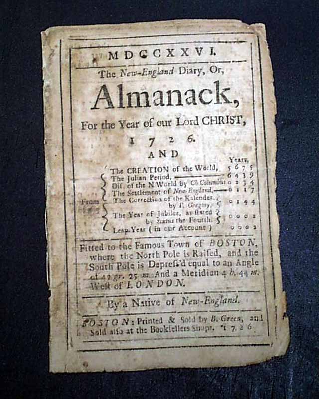 "The New-England Diary, Or, ALMANACK For the Year of our Lord Christ, 1726. This is quite rare, one of the earliest American imprints we have been fortunate enough to offer.