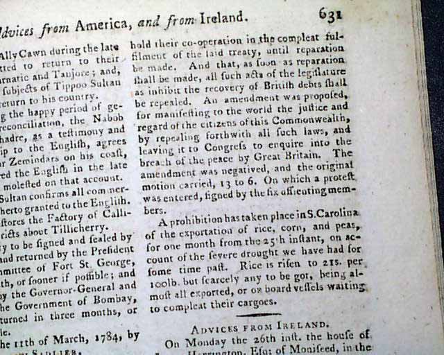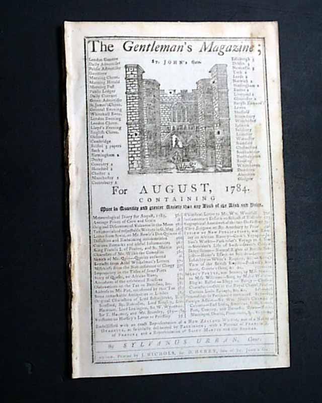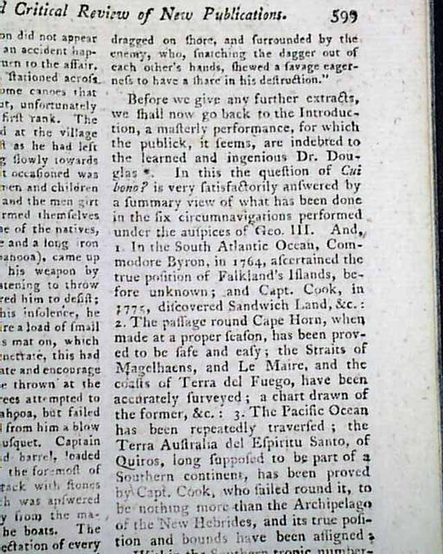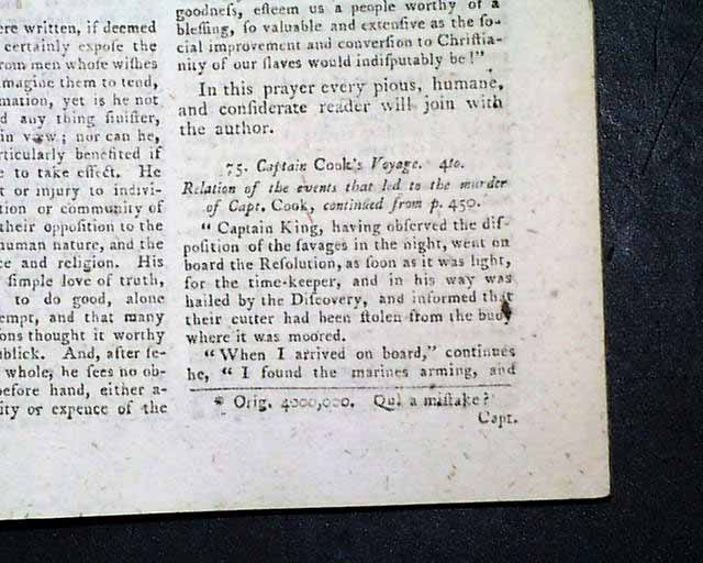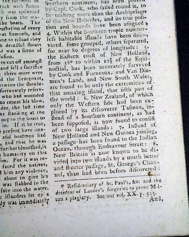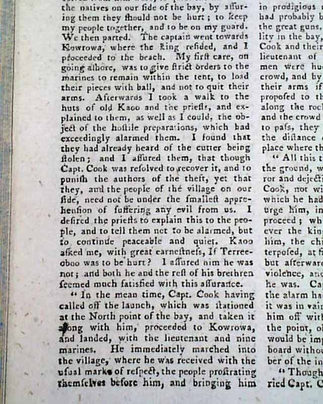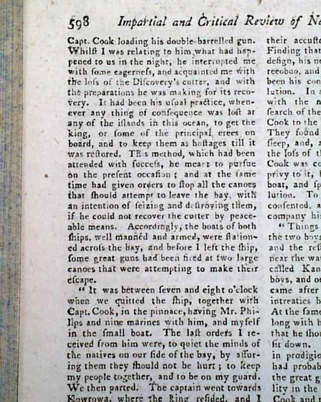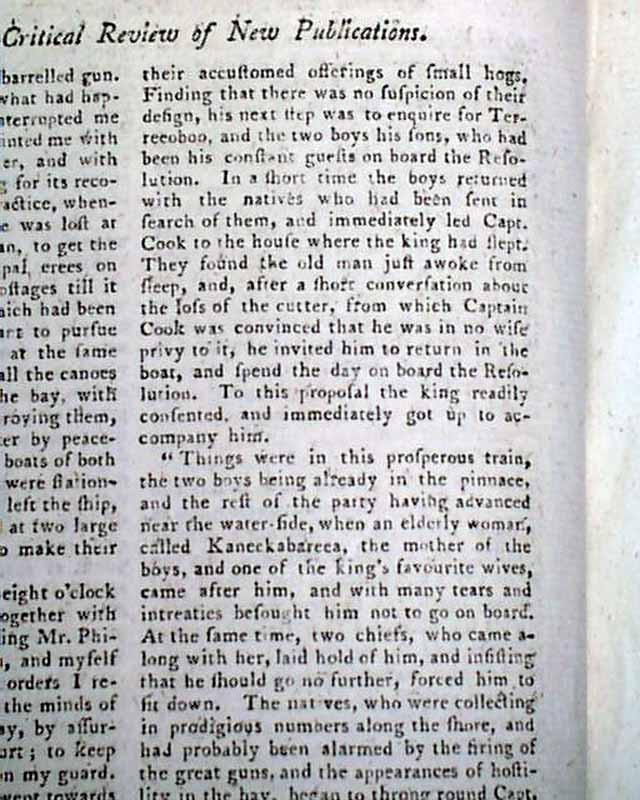 THE GENTLEMAN'S MAGAZINE, London, August, 1784 Certainly the most interesting content in this issue is the great & lengthy text (continued from the June issue) on a review of a new publication, headed: "Captain Cook's Voyage--Relation of the events that led to the murder of Capt. Cook...". This report takes nearly 3 pages, portions seen in the photos, and includes the details of the murder of Capt. Cook by the natives of Hawaii: "...What followed was a scene of the utmost horror & confusion...having turned about to give his orders to the boats, he was stabbed in the back & fell with his face into the water. On seeing him fall, the islanders set up a great shout & his body was immediately dragged on shore & surrounded by the enemy, who, snatching the dagger out of each other's hands, shewed a savage eagerness to have a share in his destruction...". At this point the article reverts to an overview of Cook's life, which is continued in the September issue.