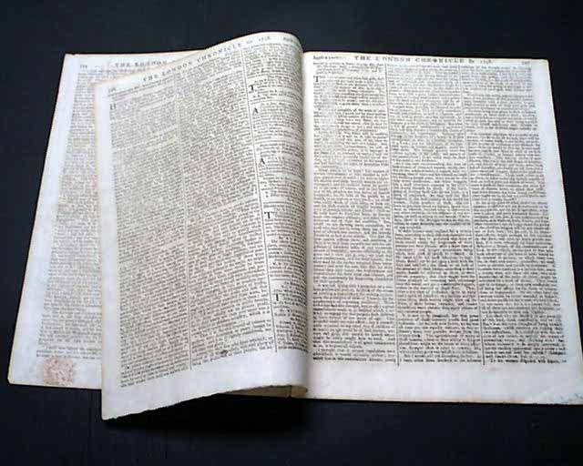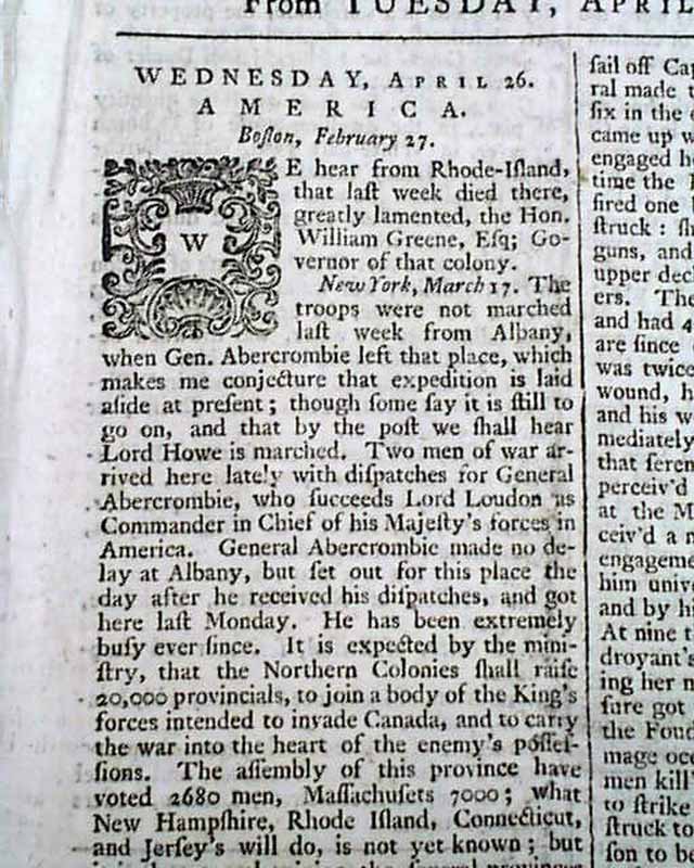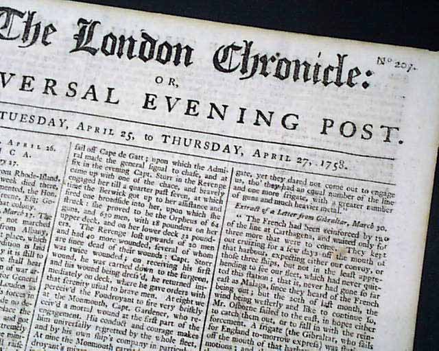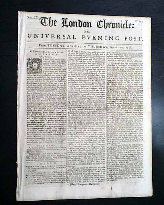THE LONDON CHRONICLE, England, April 27, 1758  Most of the first column on the front page has reports from: "America" with Boston and New York datelines including some good content on the French & Indian War, bits such as: "...that the Northern Colonies shall raise 20,000 provincials to join a body of the King's forces intended to invade Canada & to carry the war into the heart of the enemy's possessions...great number of troops are going to the eastward; some to the southward; so that there are three expeditions intended to be carried on at one and the same time..." and more.