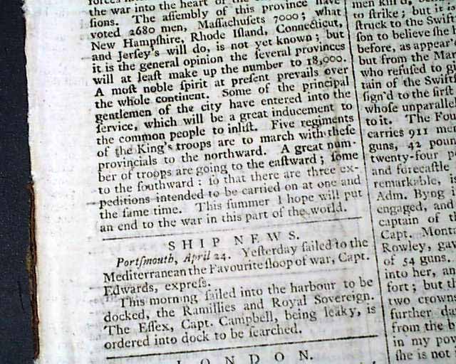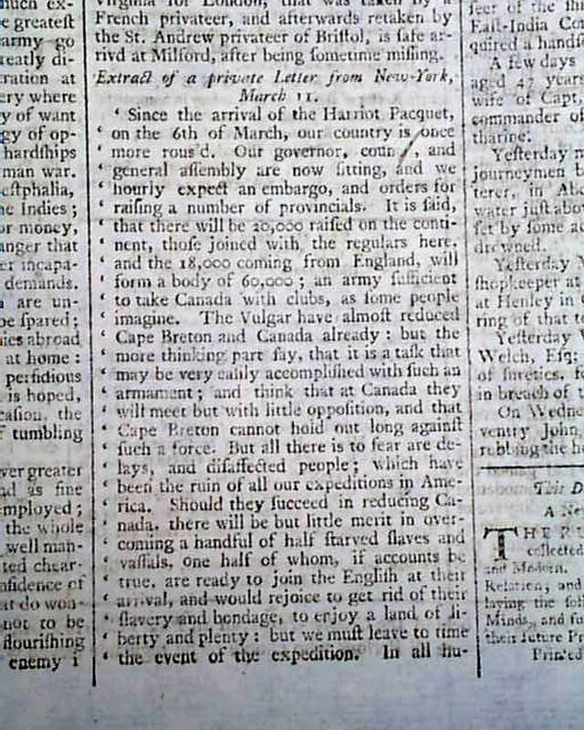 An inside page has half a column with an: "Extract of a Private Letter from New  York" which includes: "...raising a number of provincials. It is said that there will be 20,000 raised on the continent...and that 18,000 coming from England will form a body of 60,000; an army sufficient to take Canada with clubs, as some people imagine...think that at Canada they will meet but with little opposition & that Cape Breton cannot hold out long against such a force..." and more.