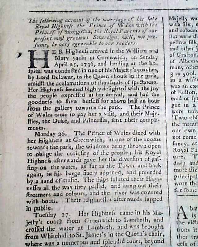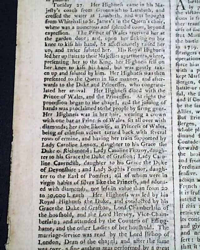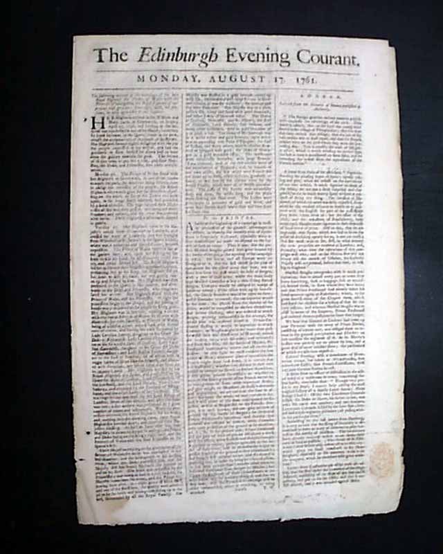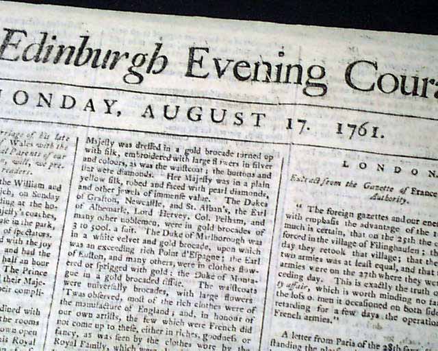 THE EDINBURGH EVENING COURANT, Scotland, Aug. 17, 1761  The front page has an account of the marriage of the Prince of Wales, heir to the British throne, and princess of Saxe Gotha. He would predecease his father so would not become King.