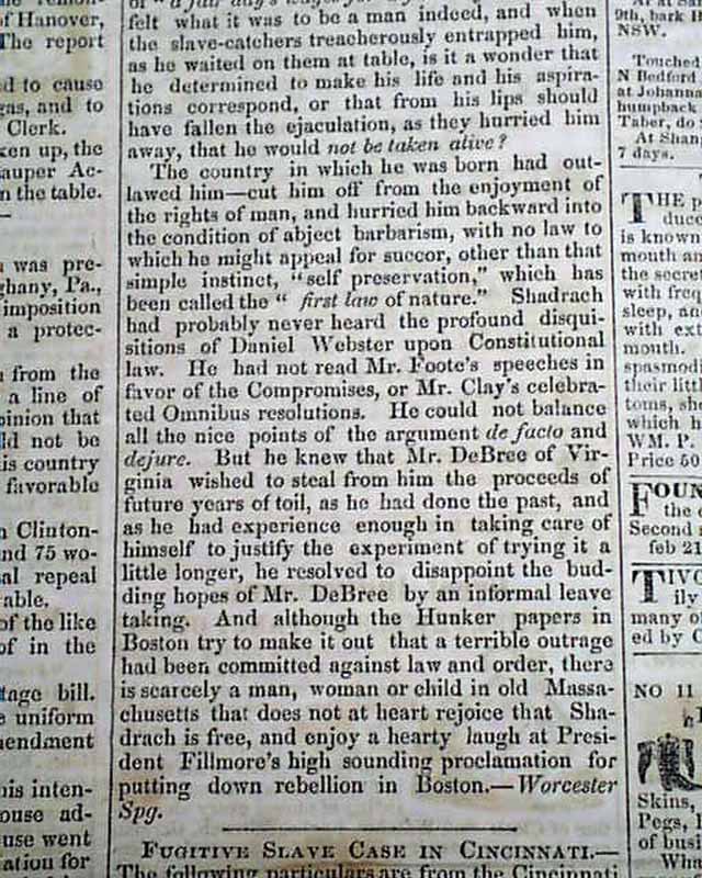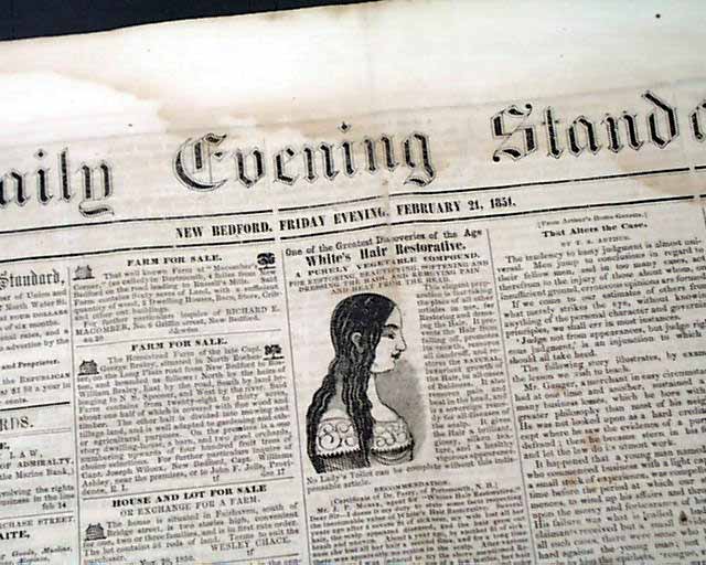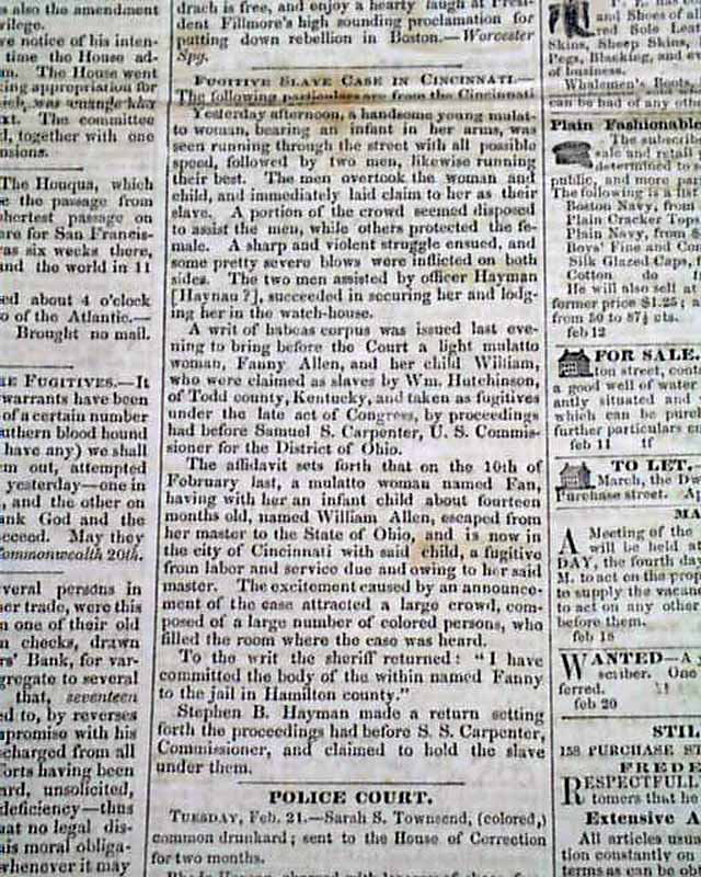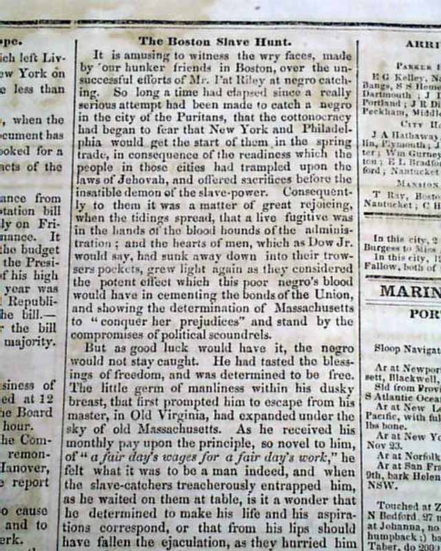 DAILY EVENING STANDARD, New Bedford, Massachusetts, Feb. 21, 1851 Two articles take most of a page 2 column: "The Boston Slave Hunt" with an interesting account. it notes in part: "It is amusing to witness the wry faces...over the unsuccessful efforts...at negro catching. So long a time had elapsed since a really serious attempt had been made to catch a negro in the city of the Puritans...But as good luck would have it, the negro would not stay caught. He had tasted the blessings of freedom & was determined to be free..." with much more.
