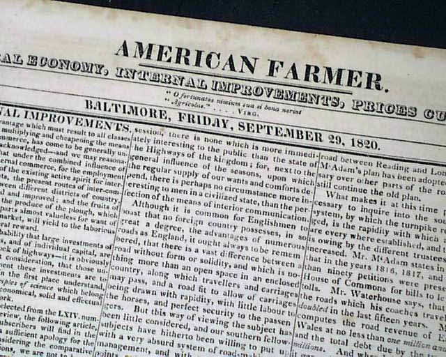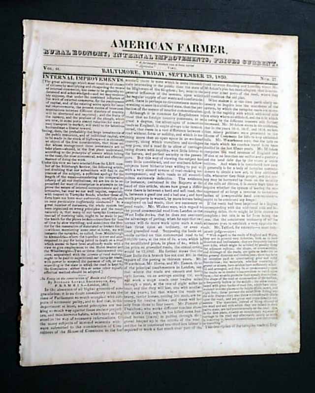 AMERICAN FARMER, Baltimore, Maryland, Sept. 29, 1820 Subtitled: "Rural Economy, Internal Improvements, Prices Current" which pretty much describes the content within.