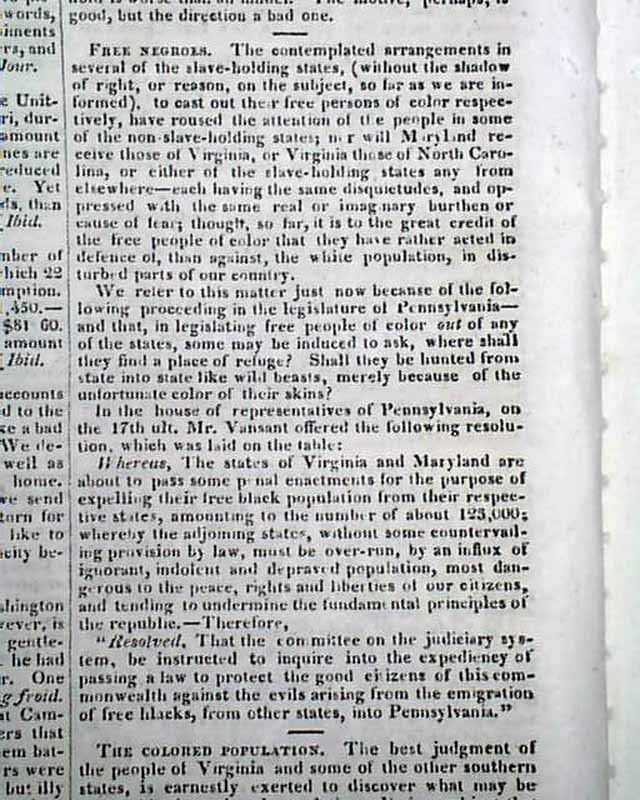 The same page has an article: "Free Negroes" and yet another with a small head: "The Colored Population".
