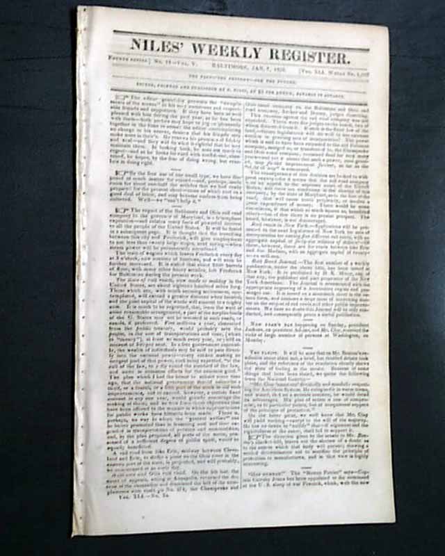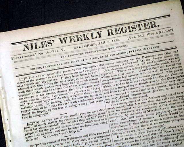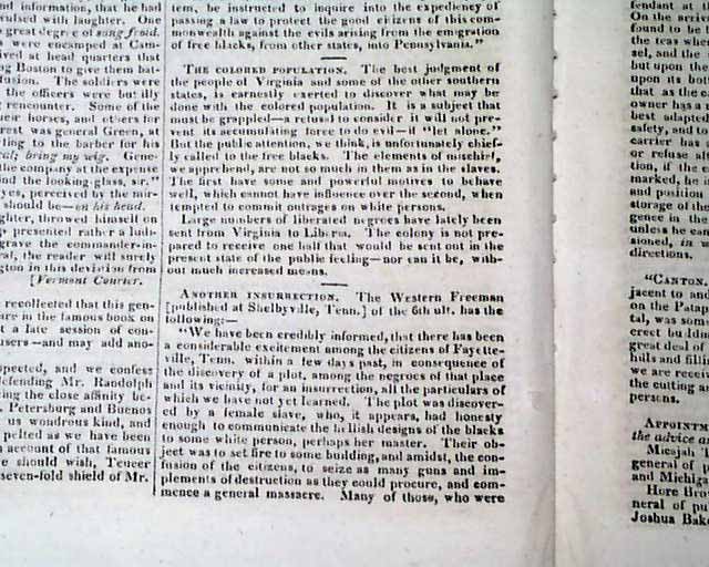 NILES' WEEKLY REGISTER, Baltimore, Jan. 7, 1832  Within is an article with a small heading: "Another Insurrection" with a portion of the text including: "We have been credibly informed...among the citizens of Fayetteville, Tenn...the discovery of a plot, among the negroes of that place...for an insurrection, all the particulars of which we have not yet learned. The plot was discovered by a female slave...Their object was to set fire to some buildings...to seize as many guns & implements of destruction...and commence a general massacre..." with a bit more.