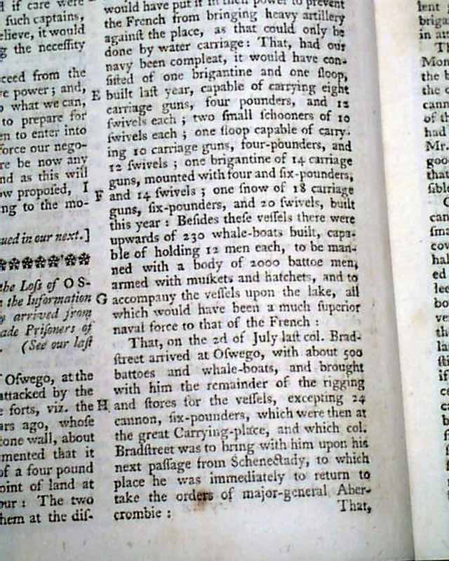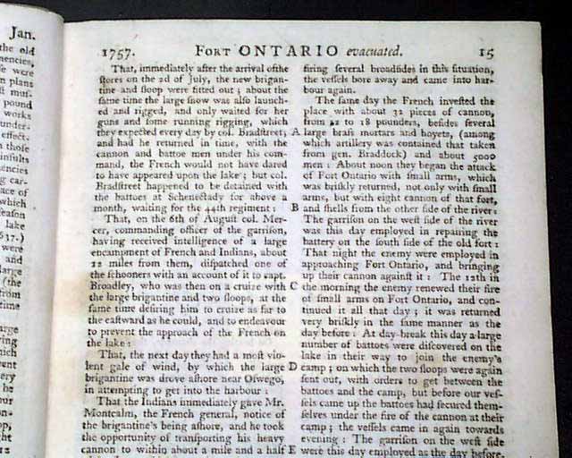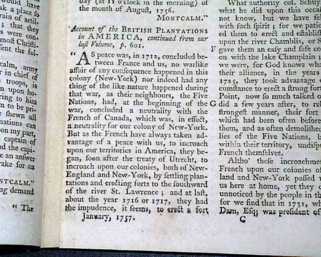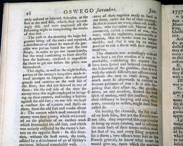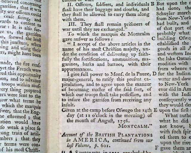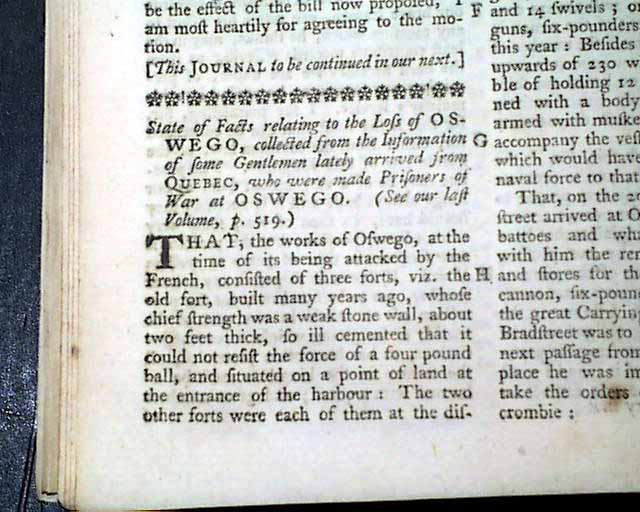 Much reporting on the French & Indian War events in New York including: "State of Face Relating to the Loss of Oswego..." which takes several pages. Also: "Fort Ontario Evacuated" "Oswego Surrenders" "Account of the British Plantations in America" "Disputes at New York" and "Situation and Soil of New York".