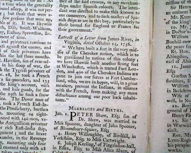 Near the back is an: "Extract of a Letter from Jame River, in Virginia" which begins: "We have built a fort in the very middle of the Cherokee nation, which is to be garrisoned by natives of this colony..." with more.
