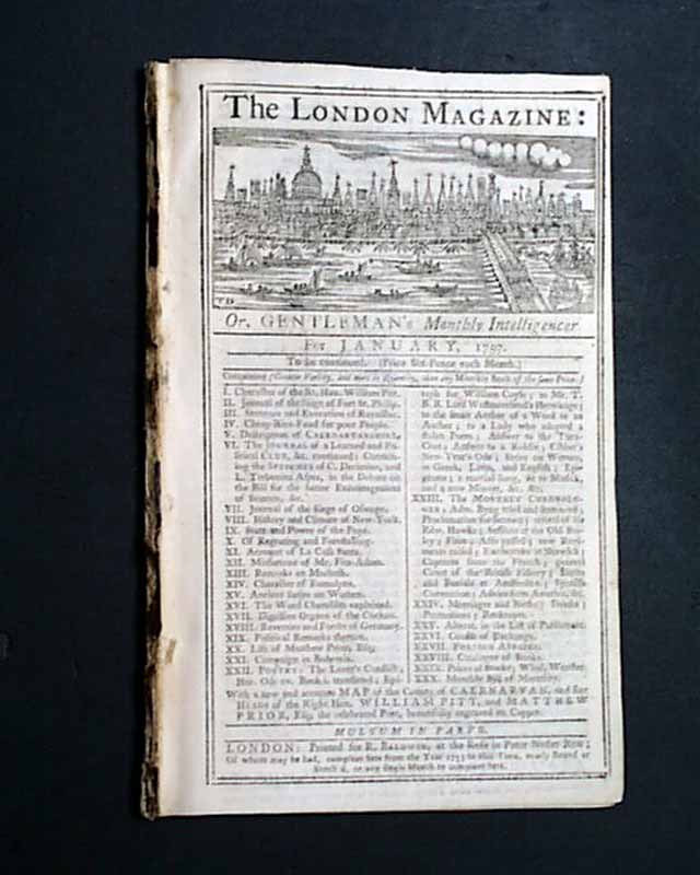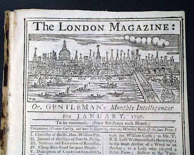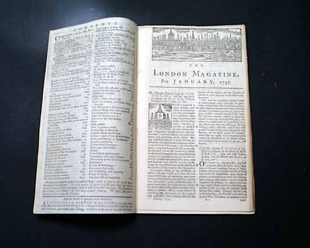 THE LONDON MAGAZINE, England, January, 1757 This title is less common than the popular "Gentleman's Magazine", and contains a wonderful, very ornate engraving of the skyline of London on the title page as well as on the first page.