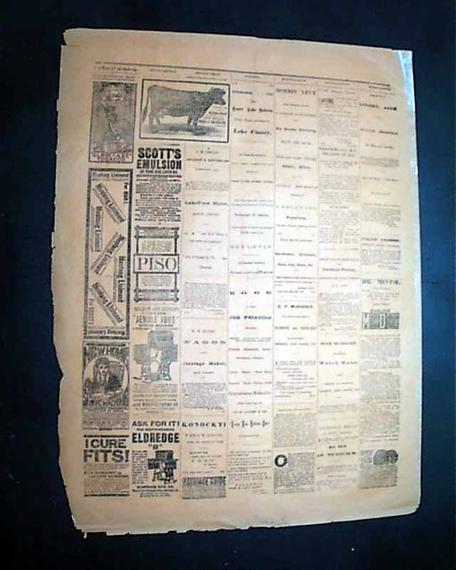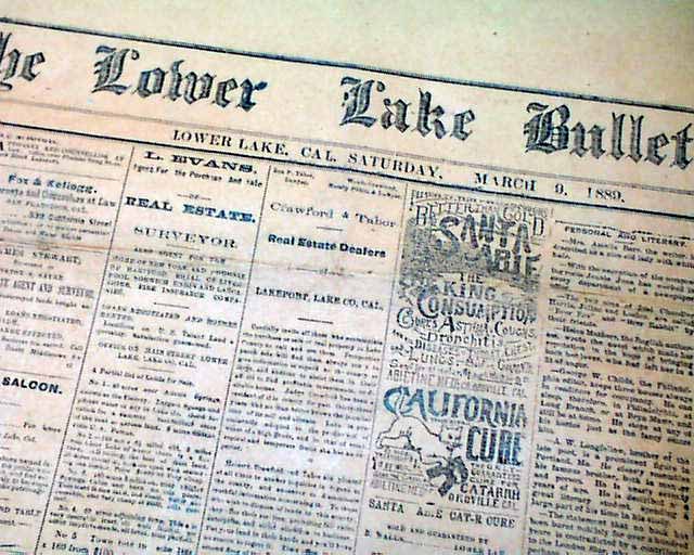 THE LOWER LAKE BULLETIN, Lower Lake, California, March 9, 1889  Not only is this the first of this title we have offered, but it is a rarity in that it is printed on orange "necessity paper". Such paper is non-typical newsprint used when the normal supply of paper is not available, usually due to weather and transportation issues. And usually affected are smaller towns in remote areas where weather & transportation can be seasonal problems.