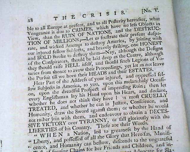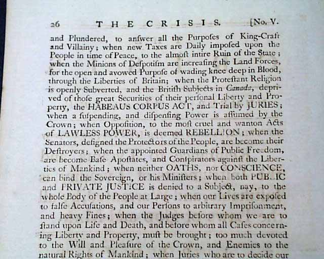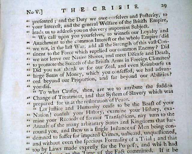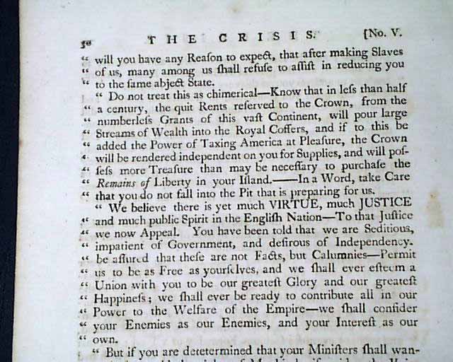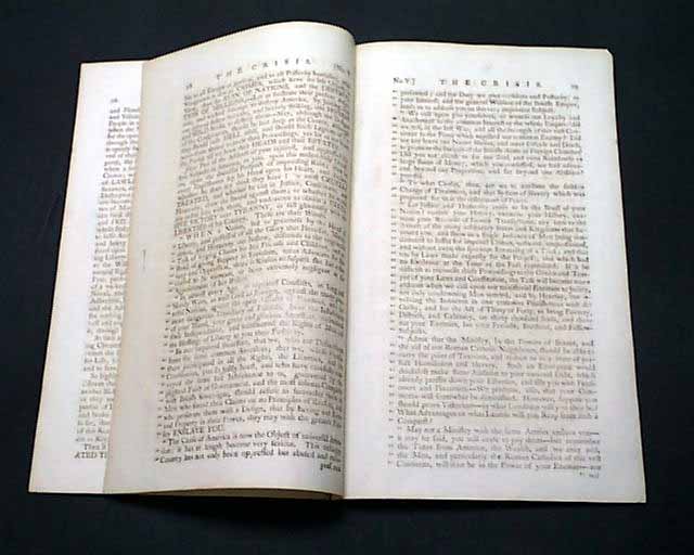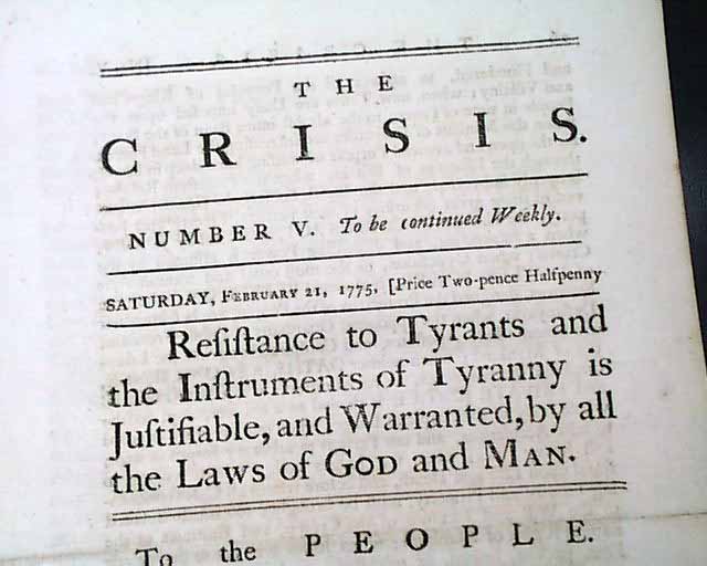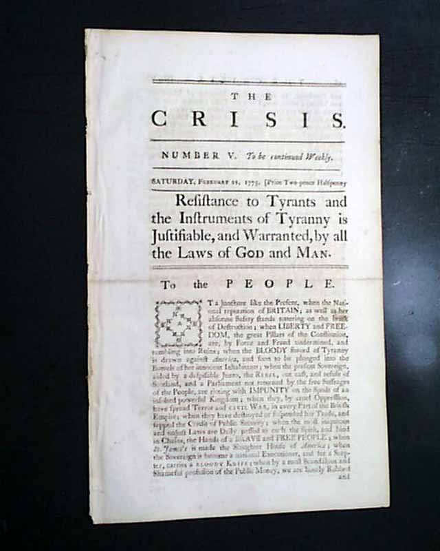 THE CRISIS, London, March 11, 1775 In our over 50 years of dealing in rare newspapers, we have only once had the great fortune to encounter issues of this very rare title. Although we had sold all years ago, this one has come back to us.