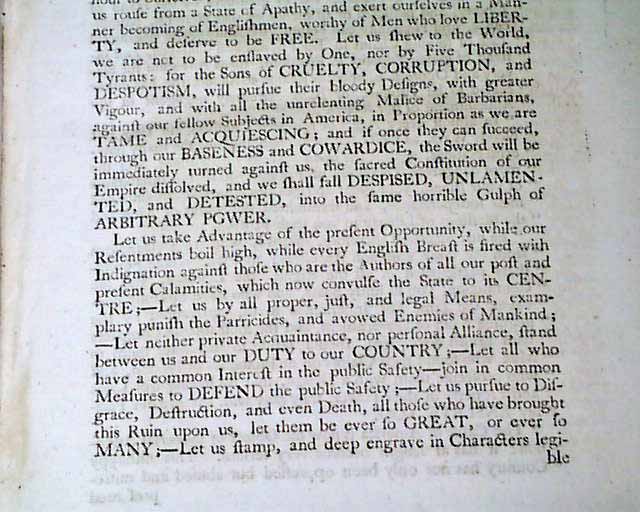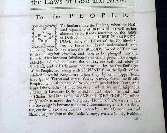 This front page begins: "To The People" "At a juncture like the present, when the national reputation of Britain; as well as her absolute safety stands tottering on the brink of destruction; when Liberty and Freedom, the great pillars of the Constitution, are, by force and fraud undermined, and tumbling into ruins; when the Bloody sword of Tyranny is drawn against America, and soon to be plunged into the bowels of her innocent inhabitants..." and much more.