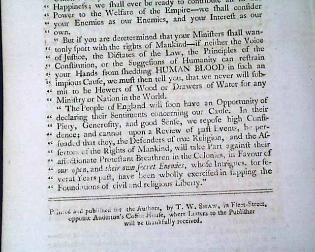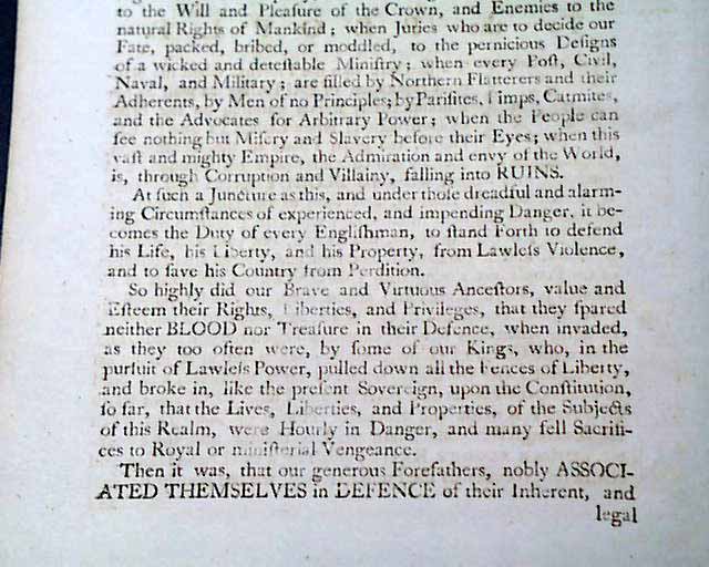 This extraordinary paper is one of the most bitter political sheets to be found, issued in London both in defense of American liberty and their cause for independence, as well as to attack the policies of the King of England. One scholar noted: "This title, which is of great rarity, contains a remarkable collection of papers attacking the Ministry & the British Government in terms of the greatest severity. Indeed, one can hardly believe that in time of war a publication of such character would be tolerated."