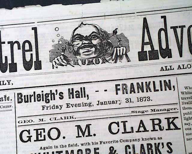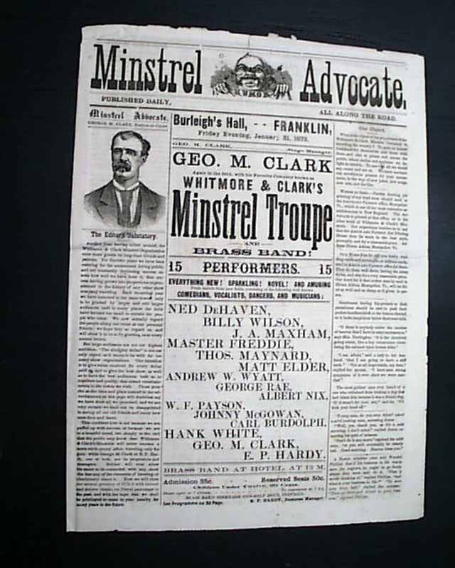 MINSTREL ADVOCATE, "Published Daily, All Along The Road" as noted in the masthead. This is a house newspaper for the Whitmore & Clark Minstrel Troupe that performed across the country. The date of one appearance is noted near the top: January 31, 1873.