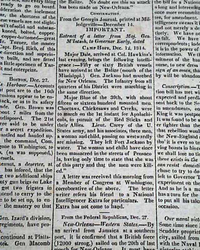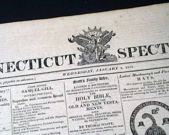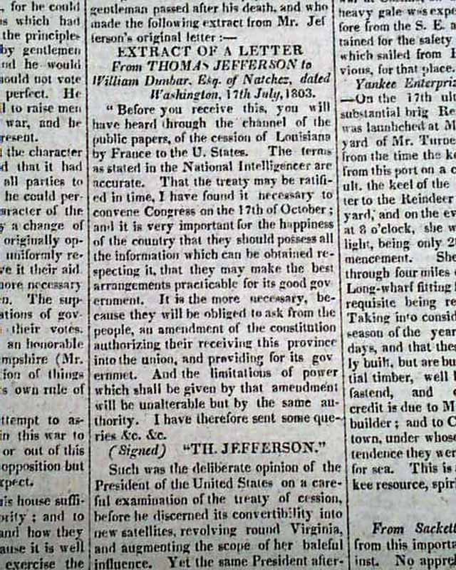 CONNECTICUT SPECTATOR, Middletown, Jan. 4, 1815 Page 2 has a printing of an: "Extract Of A Letter From Thomas Jefferson" to William Dunbar at Natchez, dated in 1803. It begins: "Before you receive this, you will have heard through the channel of the public papers, of the cession of Louisiana by France to the U. States..." with more on this, signed in type: Th. Jefferson.