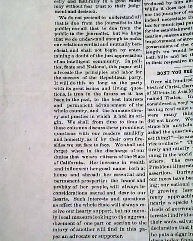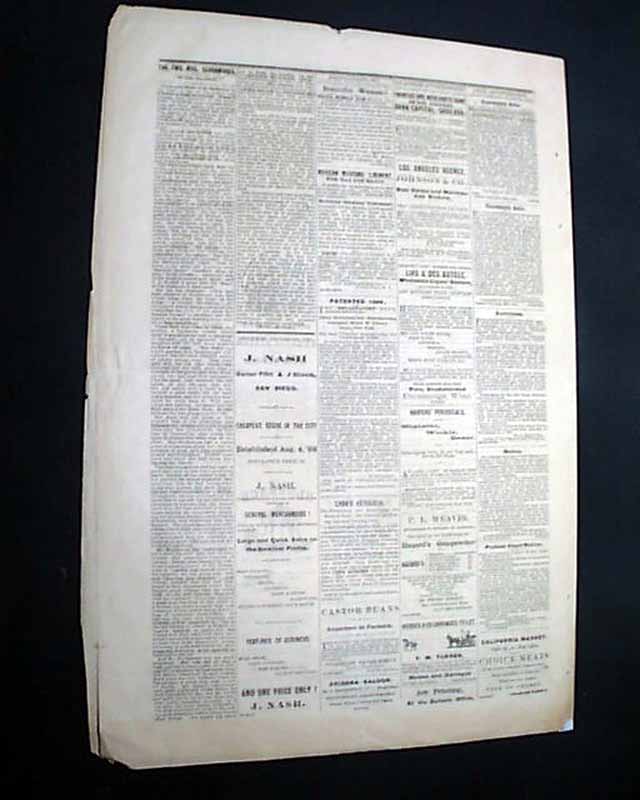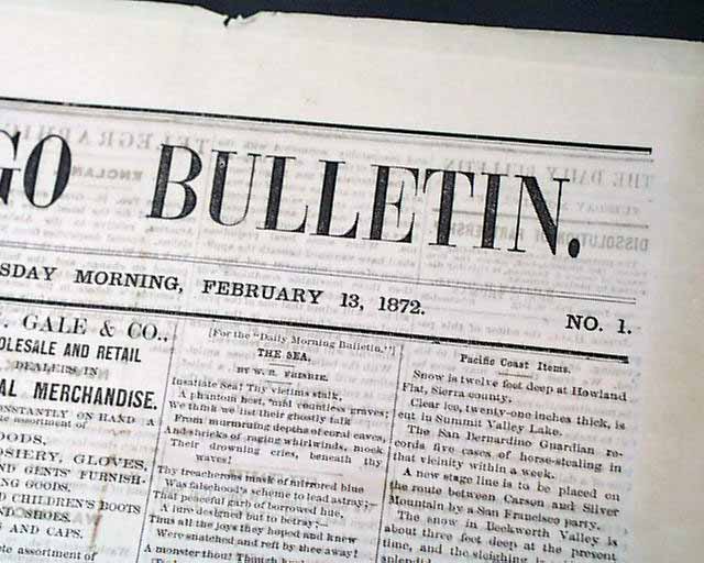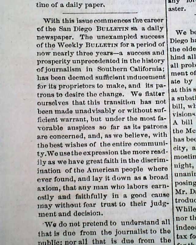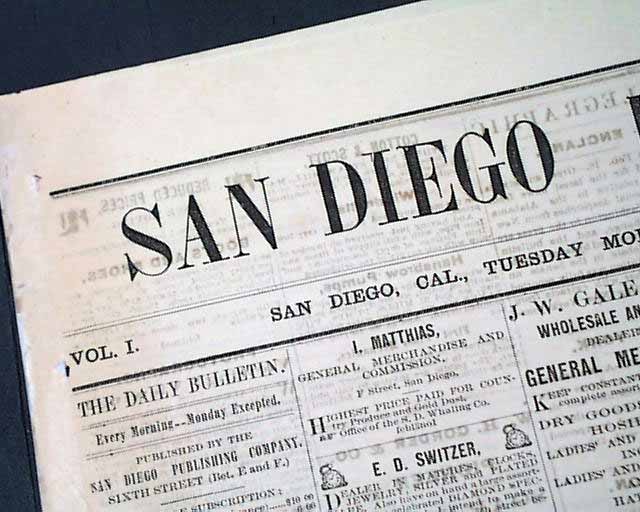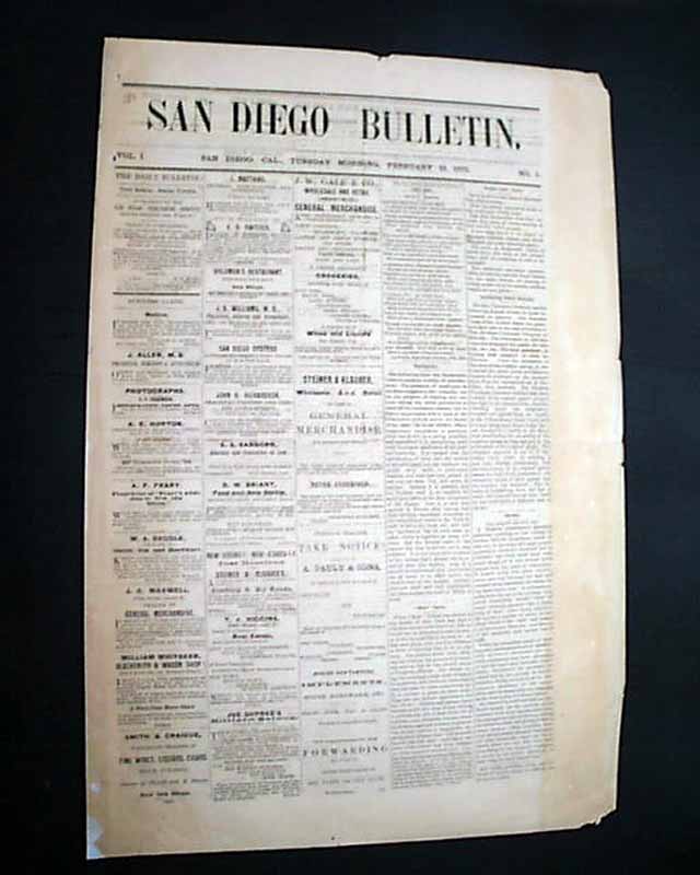 SAN DIEGO BULLETIN, California, Feb. 13, 1872 This is the first issue published of the daily paper, the volume 1, number 1 issue. It was preceded by almost 3 years by the weekly edition. It also was very short-lived, existing only thru July 23, 1872, with the weekly paper ceasing publication at the same time. Given this, it is rare to find any issues.