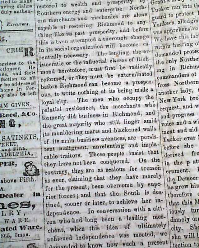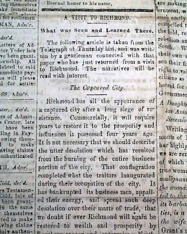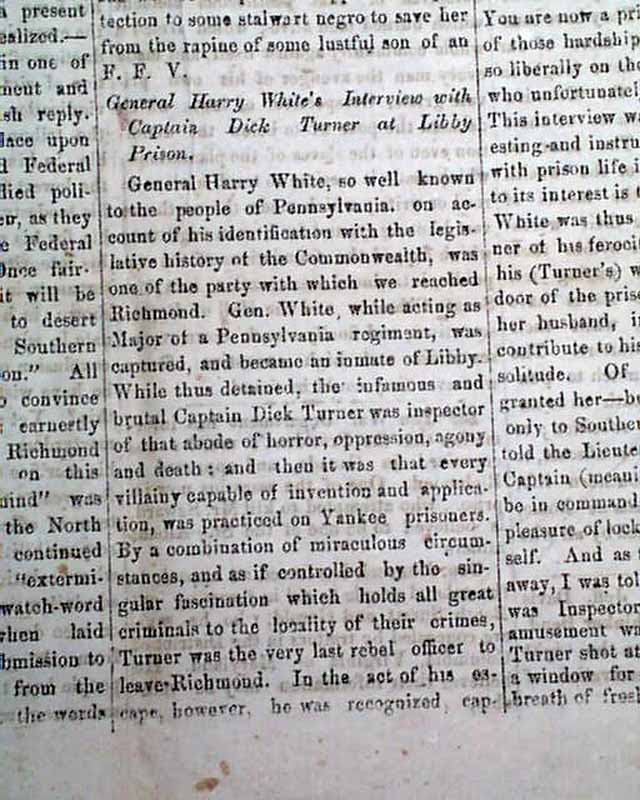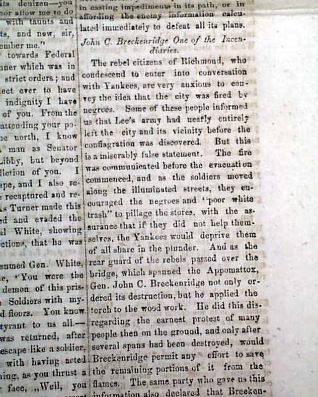 The front page is mostly with a lengthy & detailed report: "A Vist To Richmond - What was Seen & Learned There" with subheads: "The Captured City" "General H. White's Interview with apt. Dick Turner at Libby Prison" "John Breckenridge One of the Incendiaries".