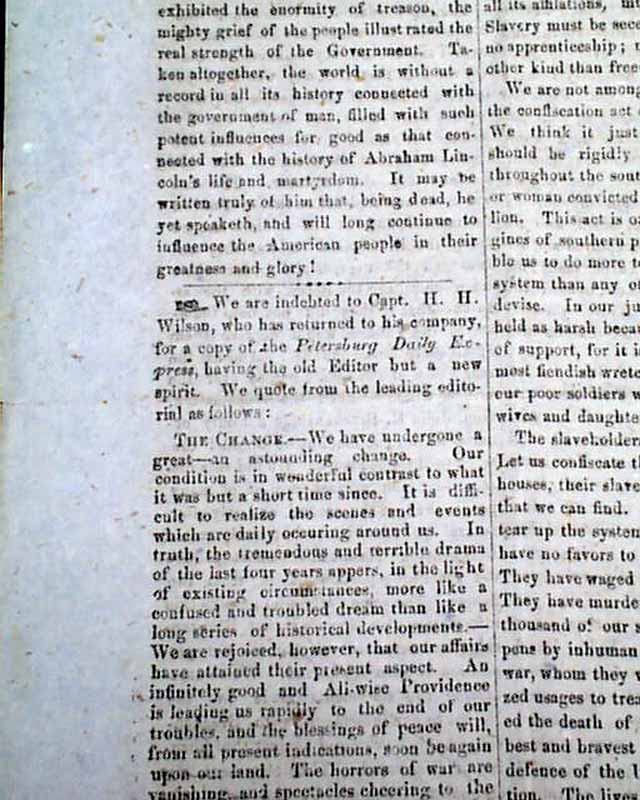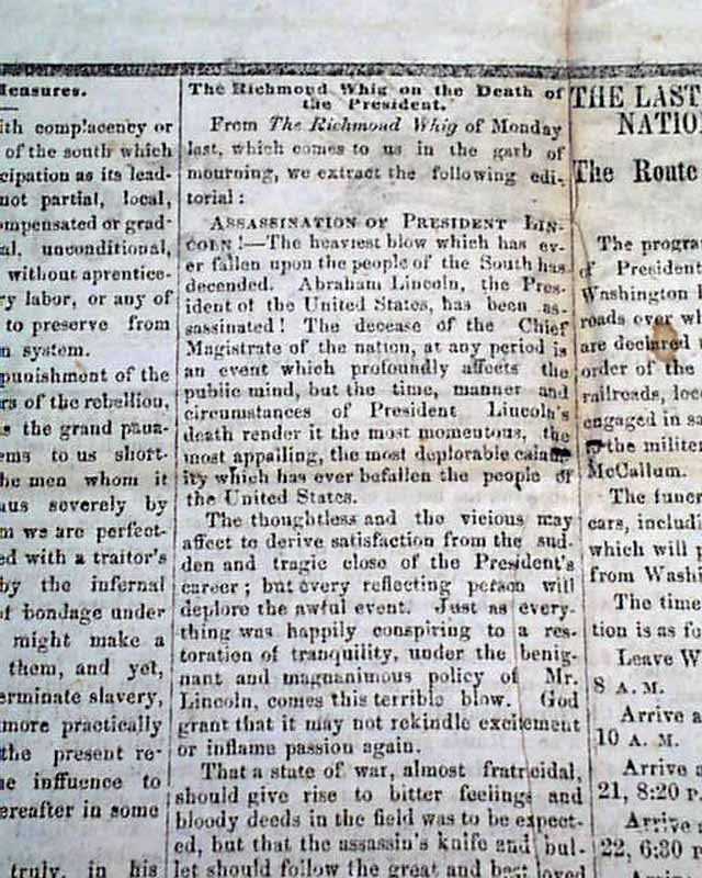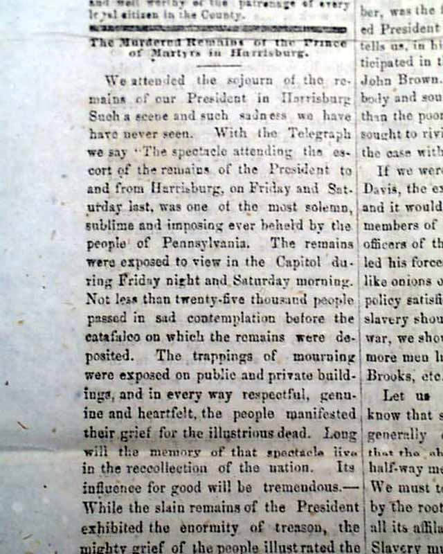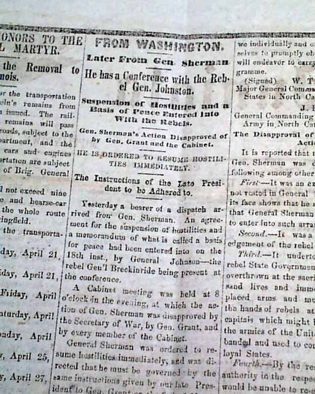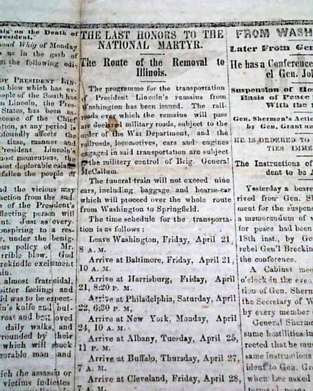 Inide has: " The Murdered Remains of the Prince of Martyrs in Harrisburg" concerning Lincoln; "The Last Honors to the National Martyr - The Route of the Removal to Illinois" "The Richmond Whig on the Death of the President" "Later From Gen. Sherman - He Has a Conference with the Rebel Gen. Johnston" "Suspension of Hostilities & a Basis of Peace Entered Into with the Rebels" with more.