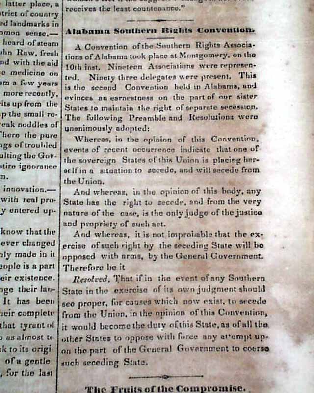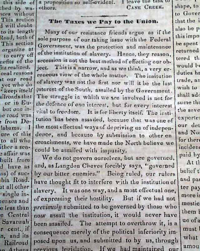 Among the articles: "The Taxes We Pay to the Union" "Alabama Southern Rights Convention" "The Late John C. Calhoun" and: "The Consequences of Coercion".