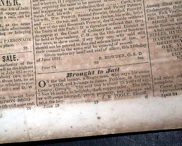 background: The Spartan, established in December 1843 by attorney T.O.P. Vernon, serves as a premier primary source for the "Upcountry" South Carolina experience during the volatile decade leading up to the American Civil War. This specific issue from June 26, 1851, captures the region at a crossroads; it was published during a year when J. Wofford Tucker acquired a half-interest in the paper and the state was deeply divided over the Compromise of 1850 and the burgeoning secessionist movement. As the predecessor to the Carolina Spartan, which eventually became the modern Spartanburg Herald-Journal, the 1851 edition is a remarkable rarity given the scarcity of surviving pre-war Southern newsprint. Beyond its political weight, the paper functions as a detailed census of mid-19th-century life, blending national legislative debates with the hyper-local realities of the Spartanburg District—from the growth of early textile mills and the completion of vital railroad lines to the harrowing advertisements regarding enslaved individuals that characterized the era's socioeconomic landscape.
