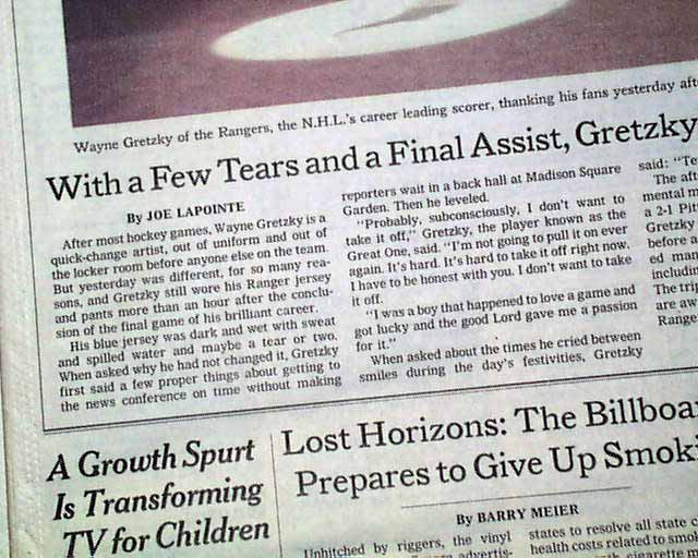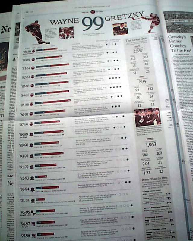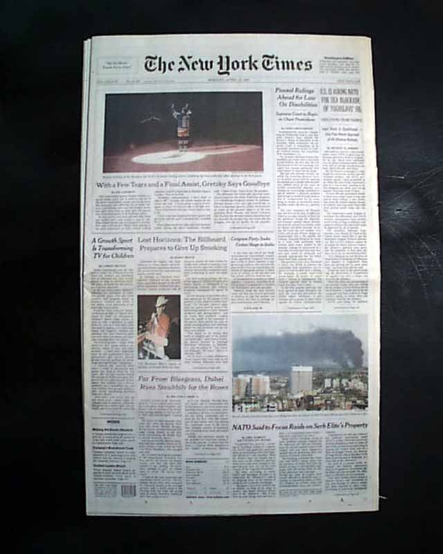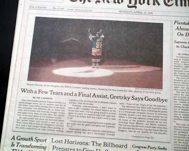 NEW YORK TIMES, April 19, 1999  The front page has a four column photo  titled: "With a Few Tears and a Final Assist, Gretzky Says Goodbye".