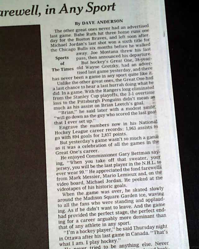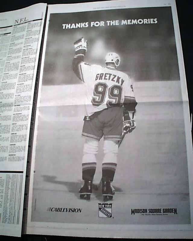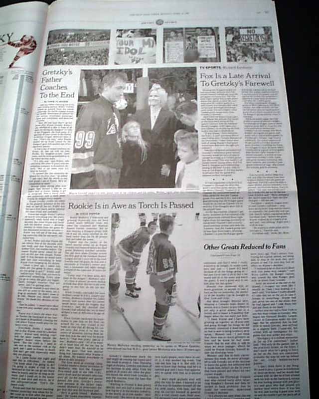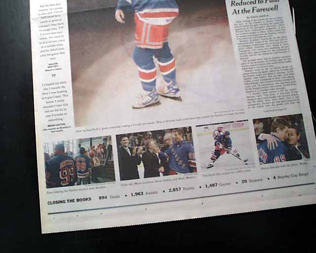 The front page of the sports section has a much larger photo of Gretzky waving to the crowd, headed: "THE GREAT GOODBYE" with more, and additional reports within.