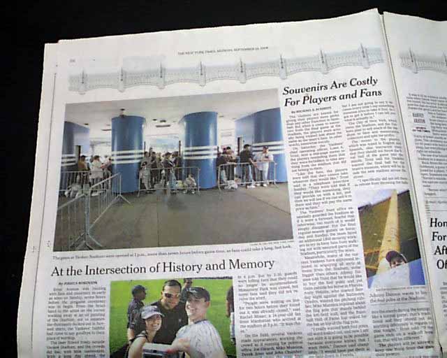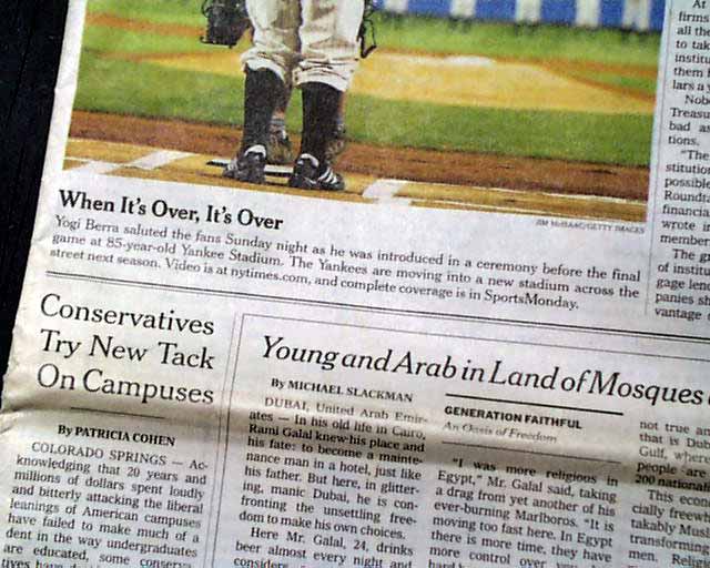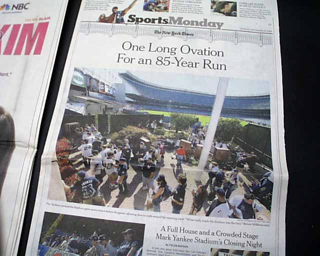 The front page features a color photo captioned: "When It's Over, It's Over..." showing Yogi Berra saluting to the fans during a ceremony before the final game at the 85 year-old Yankee Stadium.