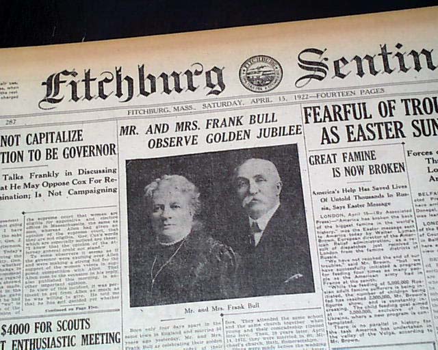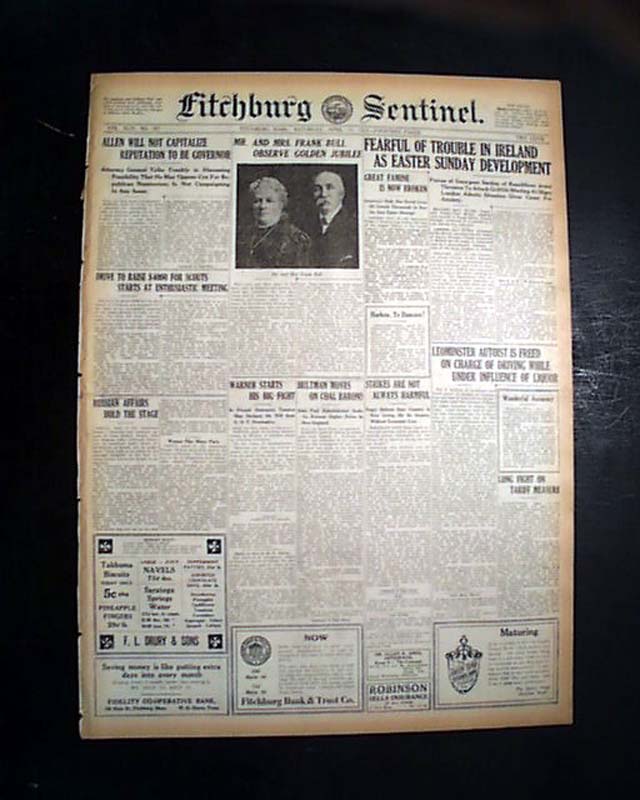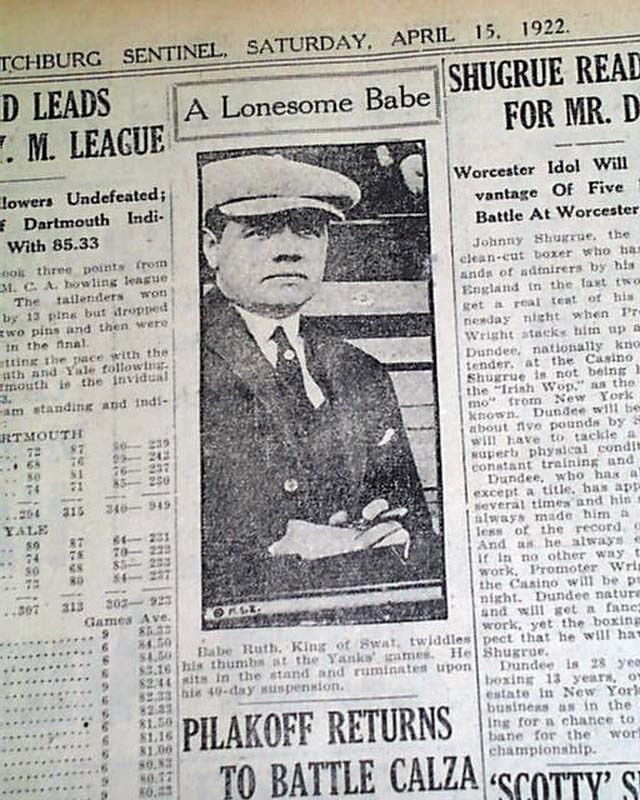 FITCHBURG SENTINEL, Massachusetts, April 15, 1922 The sports page has a one-column photo of Babe Ruth headed: "A Lonesome Babe" with a caption noting him watching a Yankees game due to his 40-day suspension.