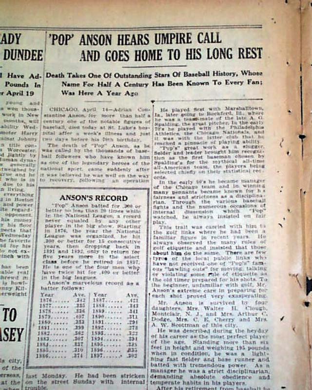 Also a report on the death of famous ball player Cap Anson: " 'Pop' Anson Hears Umpire Call And Goes Home To His Long Rest" with much on his life & career.